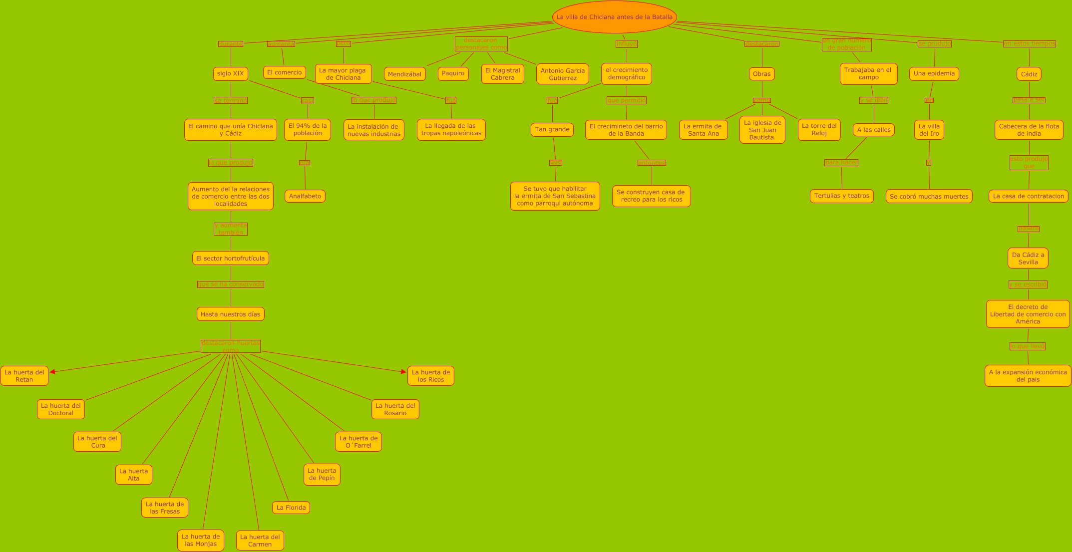 Este mapa conceptual tiene información relacionada a: 03.José María Aragón Meléndez.Chiclana antes de la batalla, Obras como La torre del Reloj, Tan grande que Se tuvo que habilitar la ermita de San Sebastina como parroqui autónoma, Una epidemia en La villa del Iro, Hasta nuestros días destacaron huertas como La Florida, El crecimineto del barrio de la Banda entonces Se construyen casa de recreo para los ricos, Hasta nuestros días destacaron huertas como La huerta de las Fresas, Hasta nuestros días destacaron huertas como La huerta del Cura, Hasta nuestros días destacaron huertas como La huerta del Retan, El 94% de la población era Analfabeto, La villa de Chiclana antes de la Batalla destacaron Obras, A las calles para hacer Tertulias y teatros, El comercio lo que produjo La instalación de nuevas industrias, Hasta nuestros días destacaron huertas como La huerta del Doctoral, Hasta nuestros días destacaron huertas como La huerta del Rosario, Da Cádiz a Sevilla y se escribió El decreto de Libertad de comercio con América, La mayor plaga de Chiclana fué La llegada de las tropas napoleónicas, Obras como La ermita de Santa Ana, La villa de Chiclana antes de la Batalla destacaron personajes como Antonio García Gutierrez, Hasta nuestros días destacaron huertas como La huerta de Pepín, Cabecera de la flota de india esto produjo que La casa de contratacion