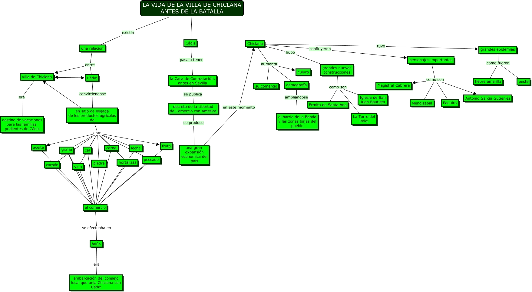 Este mapa conceptual tiene información relacionada a: 08.Pablo Cossío Guerrero.La vida de chiclana antes de la batal0la, Villa de Chiclana era destino de vacaciones para las familias pudientes de Cádiz, Chiclana aumenta su comercio, una relación entre Cádiz, en sitio de llegada de los productos agrícolas de eran cal, en sitio de llegada de los productos agrícolas de eran piedra, personajes importantes como son Paquiro, en sitio de llegada de los productos agrícolas de eran hortalizas, en sitio de llegada de los productos agrícolas de eran aceite, aceite el comercio, una gran expansión económica del país en este momento Chiclana, Chiclana tuvo grandes epidemias, grana el comercio, pescado el comercio, Cádiz pasa a tener la Casa de Contratación, antes en Sevilla, LA VIDA DE LA VILLA DE CHICLANA ANTES DE LA BATALLA existía una relación, carbón el comercio, decreto de la Libertad de Comercio con América se produce una gran expansión económica del país, falúa era embarcación del consejo local que unia Chiclana con Cádiz, cal el comercio, en sitio de llegada de los productos agrícolas de eran carbón