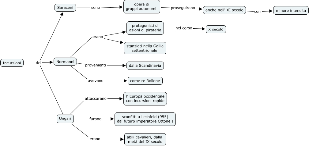 Questa Cmap, creata con IHMC CmapTools, contiene informazioni relative a: le invasioni di Normanni, Ungari,Saraceni, Ungari attaccarano l' Europa occidentale con incursioni rapide, Normanni erano stanziati nella Gallia settentrionale, Normanni provenienti dalla Scandinavia, Incursioni dei Normanni, Incursioni dei Saraceni, Ungari erano abili cavalieri, dalla metà del IX secolo, protagonisti di azioni di pirateria nel corso X secolo, anche nell' XI secolo con minore intensità, Ungari furono sconfitti a Lechfeld (955) dal futuro imperatore Ottone I, opera di gruppi autonomi proseguirono anche nell' XI secolo, Normanni erano protagonisti di azioni di pirateria, Saraceni sono opera di gruppi autonomi, Incursioni dei Ungari, Normanni avevano come re Rollone