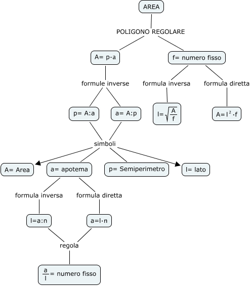 Questa Cmap, creata con IHMC CmapTools, contiene informazioni relative a: geometria -5, A= p⋅a formule inverse p= A:a, a= apotema formula inversa l=a:n, a= A:p simboli a= apotema, l=a:n regola <math xmlns="http://www.w3.org/1998/Math/MathML"> <mrow> <mfrac> <mtext> a </mtext> <mtext> l </mtext> </mfrac> <mtext> = numero fisso </mtext> </mrow> </math>, p= A:a simboli p= Semiperimetro, a=l⋅n regola <math xmlns="http://www.w3.org/1998/Math/MathML"> <mrow> <mfrac> <mtext> a </mtext> <mtext> l </mtext> </mfrac> <mtext> = numero fisso </mtext> </mrow> </math>, A= p⋅a formule inverse a= A:p, p= A:a simboli l= lato, AREA POLIGONO REGOLARE f= numero fisso, AREA POLIGONO REGOLARE A= p⋅a, a= A:p simboli p= Semiperimetro, a= apotema formula diretta a=l⋅n, p= A:a simboli a= apotema, p= A:a simboli A= Area, a= A:p simboli A= Area, f= numero fisso formula diretta <math xmlns="http://www.w3.org/1998/Math/MathML"> <mrow> <mtext> A= </mtext> <mmultiscripts> <mtext> l </mtext> <none/> <mtext> 2 </mtext> </mmultiscripts> <mtext> ⋅f </mtext> </mrow> </math>, a= A:p simboli l= lato, f= numero fisso formula inversa <math xmlns="http://www.w3.org/1998/Math/MathML"> <mrow> <mtext> l= </mtext> <msqrt> <mfrac> <mtext> A </mtext> <mtext> f </mtext> </mfrac> </msqrt> </mrow> </math>