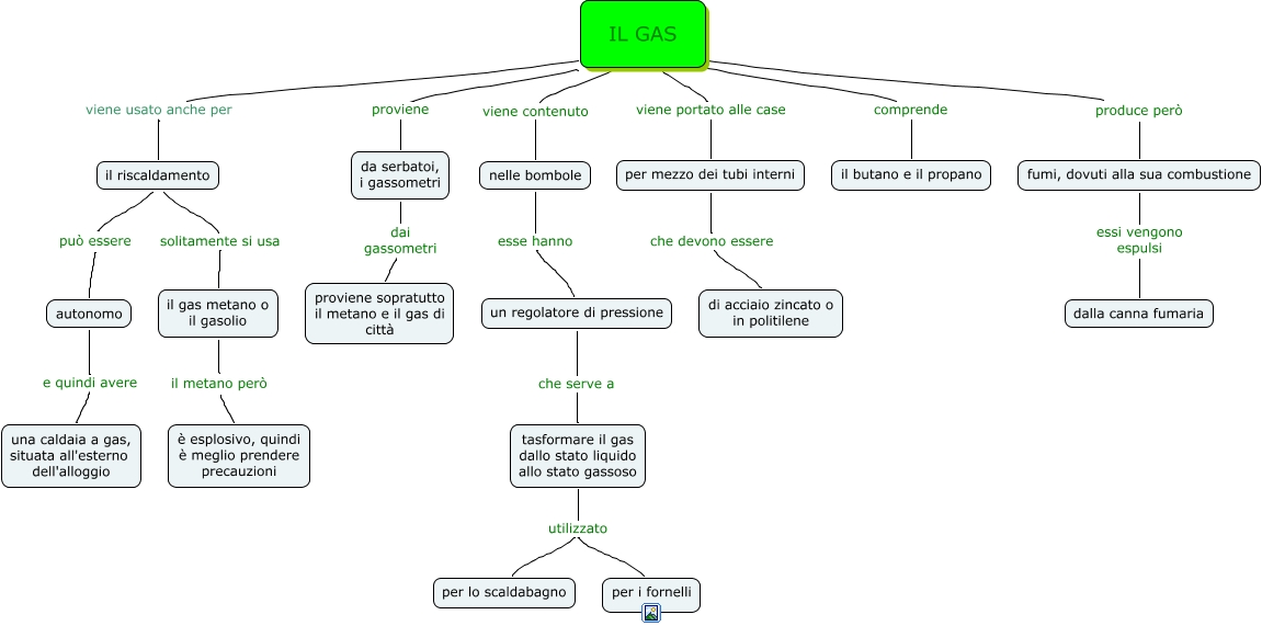 Questa Mappa Concettuale ha informazioni correlate a: il gas, un regolatore di pressione che serve a tasformare il gas dallo stato liquido allo stato gassoso, tasformare il gas dallo stato liquido allo stato gassoso utilizzato per lo scaldabagno, autonomo e quindi avere una caldaia a gas, situata all'esterno dell'alloggio, il riscaldamento può essere autonomo, IL GAS produce però fumi, dovuti alla sua combustione, tasformare il gas dallo stato liquido allo stato gassoso utilizzato per i fornelli, da serbatoi, i gassometri dai gassometri proviene sopratutto il metano e il gas di città, IL GAS proviene da serbatoi, i gassometri, il gas metano o il gasolio il metano però è esplosivo, quindi è meglio prendere precauzioni, IL GAS viene contenuto nelle bombole