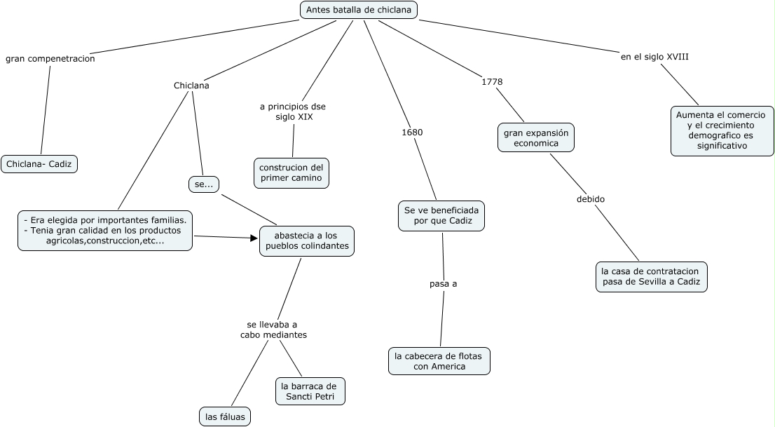 Este Cmap, tiene información relacionada con: 25.Alfonso Diaz Camacho.Chiclana antes de la batalla, Antes batalla de chiclana a principios dse siglo XIX construcion del primer camino, Antes batalla de chiclana 1778 gran expansión economica, se... abastecia a los pueblos colindantes, Antes batalla de chiclana en el siglo XVIII Aumenta el comercio y el crecimiento demografico es significativo, - Era elegida por importantes familias. - Tenia gran calidad en los productos agricolas,construccion,etc... abastecia a los pueblos colindantes, Antes batalla de chiclana Chiclana - Era elegida por importantes familias. - Tenia gran calidad en los productos agricolas,construccion,etc..., Antes batalla de chiclana gran compenetracion Chiclana- Cadiz, abastecia a los pueblos colindantes se llevaba a cabo mediantes las fáluas, Se ve beneficiada por que Cadiz pasa a la cabecera de flotas con America, Antes batalla de chiclana 1680 Se ve beneficiada por que Cadiz, gran expansión economica debido la casa de contratacion pasa de Sevilla a Cadiz, Antes batalla de chiclana Chiclana se..., abastecia a los pueblos colindantes se llevaba a cabo mediantes la barraca de Sancti Petri