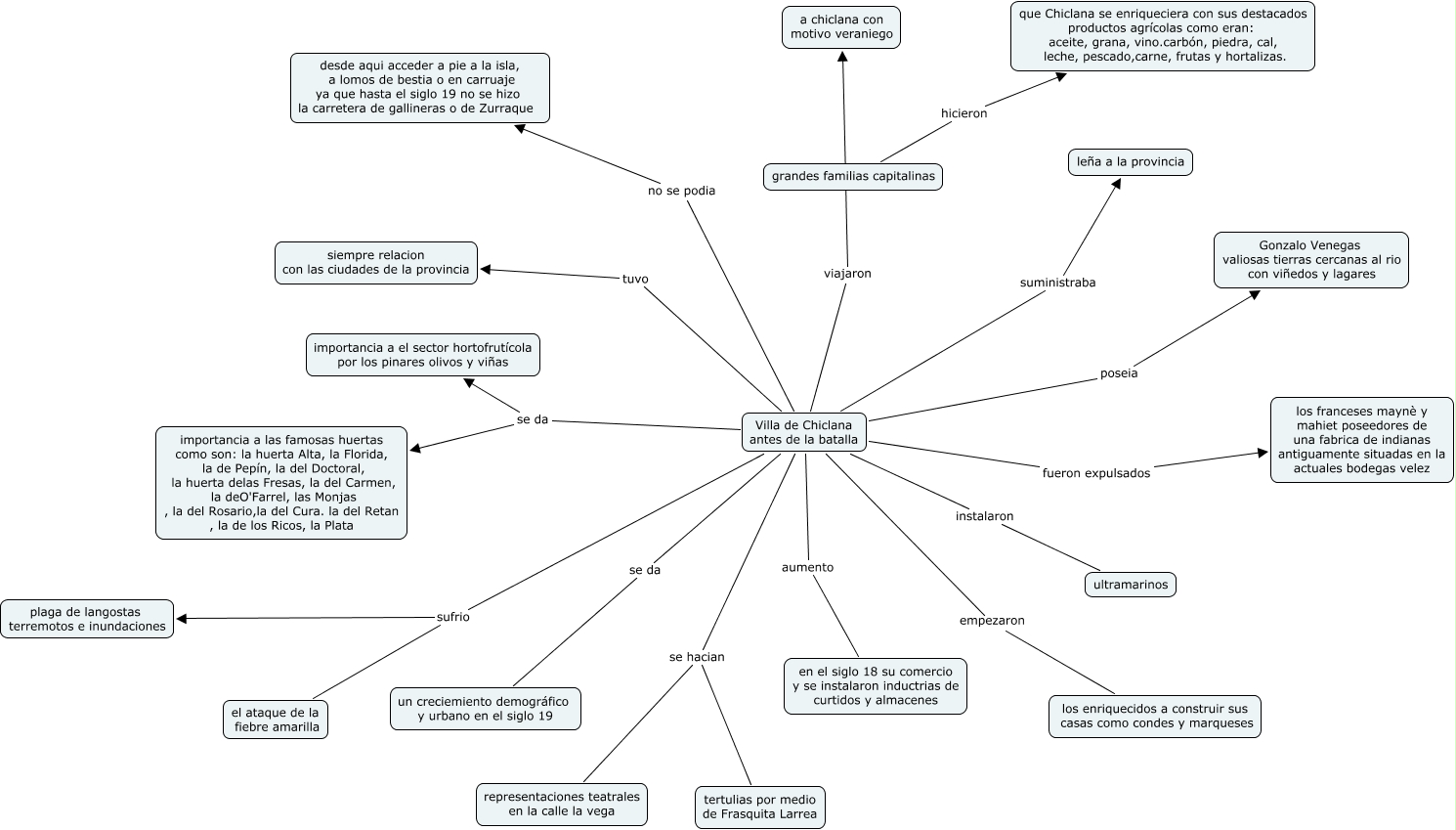 Este mapa conceptual tiene información relacionada a: 22.Juan Ulloa Gil, Villa de Chiclana antes de la batalla sufrio el ataque de la fiebre amarilla, Villa de Chiclana antes de la batalla instalaron ultramarinos, Villa de Chiclana antes de la batalla se da importancia a las famosas huertas como son: la huerta Alta, la Florida, la de Pepín, la del Doctoral, la huerta delas Fresas, la del Carmen, la deO'Farrel, las Monjas , la del Rosario,la del Cura. la del Retan , la de los Ricos, la Plata, Villa de Chiclana antes de la batalla empezaron los enriquecidos a construir sus casas como condes y marqueses, Villa de Chiclana antes de la batalla tuvo siempre relacion con las ciudades de la provincia, Villa de Chiclana antes de la batalla poseia Gonzalo Venegas valiosas tierras cercanas al rio con viñedos y lagares, grandes familias capitalinas hicieron que Chiclana se enriqueciera con sus destacados productos agrícolas como eran: aceite, grana, vino.carbón, piedra, cal, leche, pescado,carne, frutas y hortalizas., Villa de Chiclana antes de la batalla se da un creciemiento demográfico y urbano en el siglo 19, Villa de Chiclana antes de la batalla se hacian representaciones teatrales en la calle la vega, Villa de Chiclana antes de la batalla se hacian tertulias por medio de Frasquita Larrea, Villa de Chiclana antes de la batalla viajaron a chiclana con motivo veraniego, Villa de Chiclana antes de la batalla fueron expulsados los franceses maynè y mahiet poseedores de una fabrica de indianas antiguamente situadas en la actuales bodegas velez, Villa de Chiclana antes de la batalla sufrio plaga de langostas terremotos e inundaciones, Villa de Chiclana antes de la batalla suministraba leña a la provincia, Villa de Chiclana antes de la batalla no se podia desde aqui acceder a pie a la isla, a lomos de bestia o en carruaje ya que hasta el siglo 19 no se hizo la carretera de gallineras o de Zurraque, Villa de Chiclana antes de la batalla aumento en el siglo 18 su comercio y se instalaron inductrias de curtidos y almacenes, Villa de Chiclana antes de la batalla se da importancia a el sector hortofrutícola por los pinares olivos y viñas