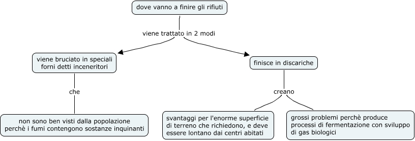 Questa Mappa Concettuale ha informazioni correlate a: dove vanno a finire i rifiuti, dove vanno a finire gli rifiuti viene trattato in 2 modi viene bruciato in speciali forni detti inceneritori, finisce in discariche creano grossi problemi perchè produce processi di fermentazione con sviluppo di gas biologici, finisce in discariche creano svantaggi per l'enorme superficie di terreno che richiedono, e deve essere lontano dai centri abitati, viene bruciato in speciali forni detti inceneritori che non sono ben visti dalla popolazione perchè i fumi contengono sostanze inquinanti, dove vanno a finire gli rifiuti viene trattato in 2 modi finisce in discariche