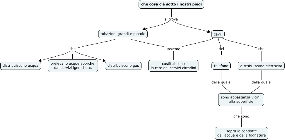 Questa Mappa Concettuale ha informazioni correlate a: cosa c'è sotto i nostri piedi, che cosa c'è sotto i nostri piedi si trova cavi, tubazioni grandi e piccole insieme costituiscono la rete dei servizi cittadini, che cosa c'è sotto i nostri piedi si trova tubazioni grandi e piccole, tubazioni grandi e piccole che distribuiscono acqua, sono abbastanza vicini alla superficie che sono sopra le condotte dell'acqua e della fognatura, cavi del telefono, telefono della quale sono abbastanza vicini alla superficie, cavi insieme costituiscono la rete dei servizi cittadini, cavi che distribuiscono elettricità, tubazioni grandi e piccole che prelevano acque sporche dai servizi igenici etc.