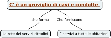 Questa Mappa Concettuale ha informazioni correlate a: Rete dei servizi cittadini, C' è un groviglio di cavi e condotte Che forniscono I servizi a tutte le abitazioni, C' è un groviglio di cavi e condotte che forma La rete dei servizi cittadini
