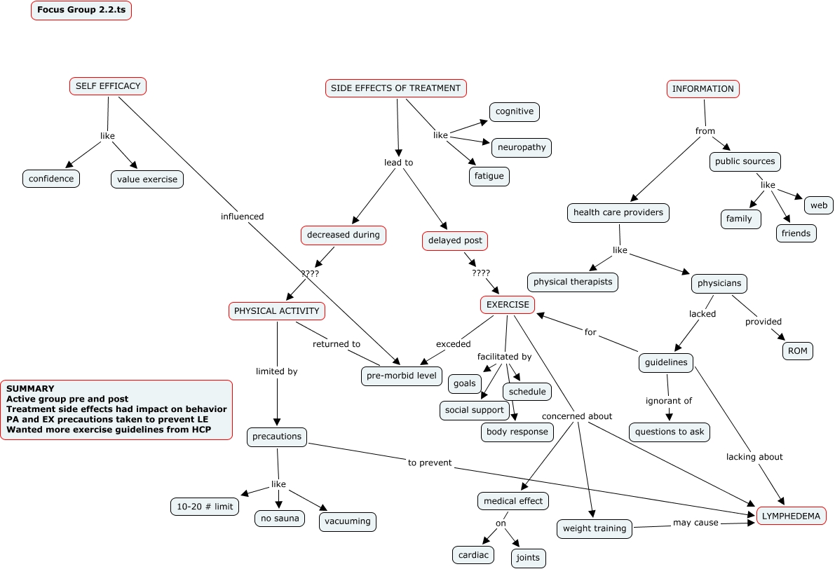 This Concept Map, created with IHMC CmapTools, has information related to: Focus group 2.2.ts, SIDE EFFECTS OF TREATMENT lead to delayed post, health care providers like physicians, guidelines ignorant of questions to ask, public sources like friends, SELF EFFICACY like value exercise, PHYSICAL ACTIVITY returned to pre-morbid level, guidelines for EXERCISE, EXERCISE concerned about weight training, delayed post ???? EXERCISE, SIDE EFFECTS OF TREATMENT like fatigue, EXERCISE concerned about LYMPHEDEMA, SIDE EFFECTS OF TREATMENT like neuropathy, EXERCISE facilitated by social support, EXERCISE facilitated by schedule, SELF EFFICACY influenced pre-morbid level, physicians provided ROM, INFORMATION from public sources, EXERCISE concerned about medical effect, EXERCISE facilitated by goals, SIDE EFFECTS OF TREATMENT like cognitive