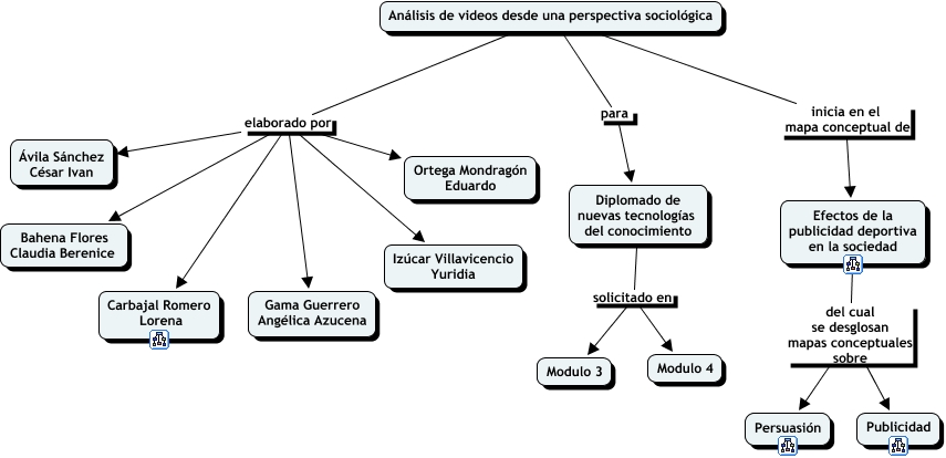 Este mapa conceptual tiene información relacionada a: Página Principal Análisis de videos, modelo de conocimiento, Análisis de videos desde una perspectiva sociológica elaborado por Carbajal Romero Lorena, Análisis de videos desde una perspectiva sociológica elaborado por Bahena Flores Claudia Berenice, Análisis de videos desde una perspectiva sociológica elaborado por Ávila Sánchez César Ivan, Efectos de la publicidad deportiva en la sociedad del cual se desglosan mapas conceptuales sobre Persuasión, Análisis de videos desde una perspectiva sociológica elaborado por Gama Guerrero Angélica Azucena, Análisis de videos desde una perspectiva sociológica elaborado por Ortega Mondragón Eduardo, Análisis de videos desde una perspectiva sociológica para Diplomado de nuevas tecnologías del conocimiento, Análisis de videos desde una perspectiva sociológica inicia en el mapa conceptual de Efectos de la publicidad deportiva en la sociedad, Efectos de la publicidad deportiva en la sociedad del cual se desglosan mapas conceptuales sobre Publicidad, Diplomado de nuevas tecnologías del conocimiento solicitado en Modulo 4