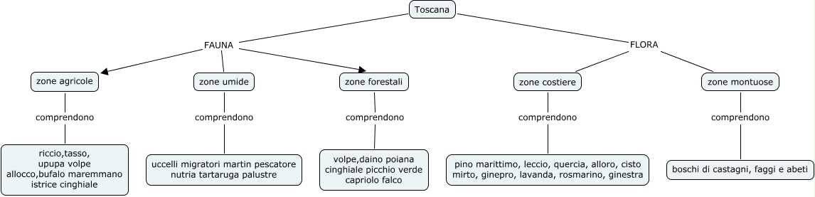 Questa Cmap, creata con IHMC CmapTools, contiene informazioni relative a: toscana flora e fauna, zone forestali comprendono volpe,daino poiana cinghiale picchio verde capriolo falco, zone agricole comprendono riccio,tasso, upupa volpe allocco,bufalo maremmano istrice cinghiale, Toscana FAUNA zone agricole, zone montuose comprendono boschi di castagni, faggi e abeti, zone umide comprendono uccelli migratori martin pescatore nutria tartaruga palustre, Toscana FAUNA zone forestali, Toscana FLORA zone montuose, Toscana FAUNA zone umide, zone costiere comprendono pino marittimo, leccio, quercia, alloro, cisto mirto, ginepro, lavanda, rosmarino, ginestra, Toscana FLORA zone costiere