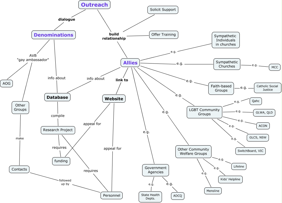This Concept Map, created with IHMC CmapTools, has information related to: Outreach, Research Project requires Personnel, LGBT Community Groups e.g. ACON, Allies e.g. Sympathetic Churches, Contacts followed up by Personnel, Sympathetic Churches e.g. MCC, LGBT Community Groups e.g. GLWA, QLD, Website appeal for Personnel, Database info about Denominations, Allies e.g. LGBT Community Groups, LGBT Community Groups e.g. GLCS, NSW, Outreach build relationship Solicit Support, Allies e.g. Government Agencies, LGBT Community Groups e.g. Qahc, Other Community Welfare Groups e.g. Mensline, Denominations AVB "gay ambassador" Other Groups, Government Agencies e.g. ADCQ, Outreach build relationship Allies, Allies e.g. Sympathetic Individuals in churches, Outreach dialogue Denominations, LGBT Community Groups e.g. SwitchBoard, VIC