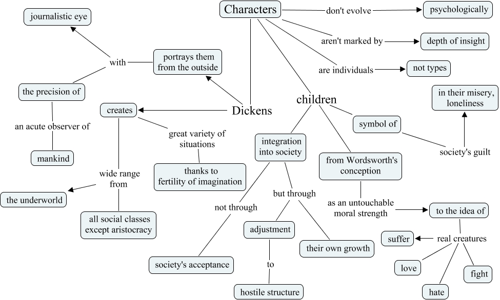 Questa Mappa Concettuale ha informazioni correlate a: C. Dickens - Characters 1, portrays them from the outside with the precision of, Characters Dickens creates, creates wide range from all social classes except aristocracy, creates great variety of situations thanks to fertility of imagination, the precision of an acute observer of mankind, to the idea of real creatures fight, Characters children symbol of, creates wide range from the underworld, Characters children from Wordsworth's conception, Characters children integration into society