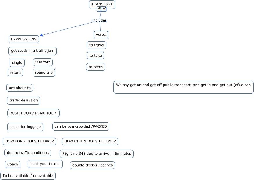 This Concept Map, created with IHMC CmapTools, has information related to: TRANSPORT, TRANSPORT includes EXPRESSIONS, TRANSPORT includes verbs