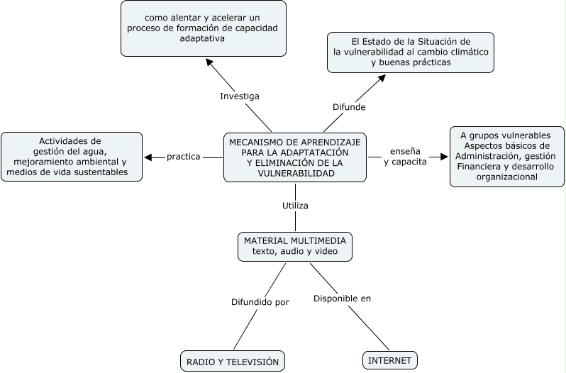 Este Cmap, tiene información relacionada con: Mecanismo de aprendizaje concepto, MATERIAL MULTIMEDIA texto, audio y video Difundido por RADIO Y TELEVISIÓN, MECANISMO DE APRENDIZAJE PARA LA ADAPTATACIÓN Y ELIMINACIÓN DE LA VULNERABILIDAD Difunde El Estado de la Situación de la vulnerabilidad al cambio climático y buenas prácticas, MECANISMO DE APRENDIZAJE PARA LA ADAPTATACIÓN Y ELIMINACIÓN DE LA VULNERABILIDAD enseña y capacita A grupos vulnerables Aspectos básicos de Administración, gestión Financiera y desarrollo organizacional, MECANISMO DE APRENDIZAJE PARA LA ADAPTATACIÓN Y ELIMINACIÓN DE LA VULNERABILIDAD Utiliza MATERIAL MULTIMEDIA texto, audio y video, MATERIAL MULTIMEDIA texto, audio y video Disponible en INTERNET, MECANISMO DE APRENDIZAJE PARA LA ADAPTATACIÓN Y ELIMINACIÓN DE LA VULNERABILIDAD practica Actividades de gestión del agua, mejoramiento ambiental y medios de vida sustentables, MECANISMO DE APRENDIZAJE PARA LA ADAPTATACIÓN Y ELIMINACIÓN DE LA VULNERABILIDAD Investiga como alentar y acelerar un proceso de formación de capacidad adaptativa