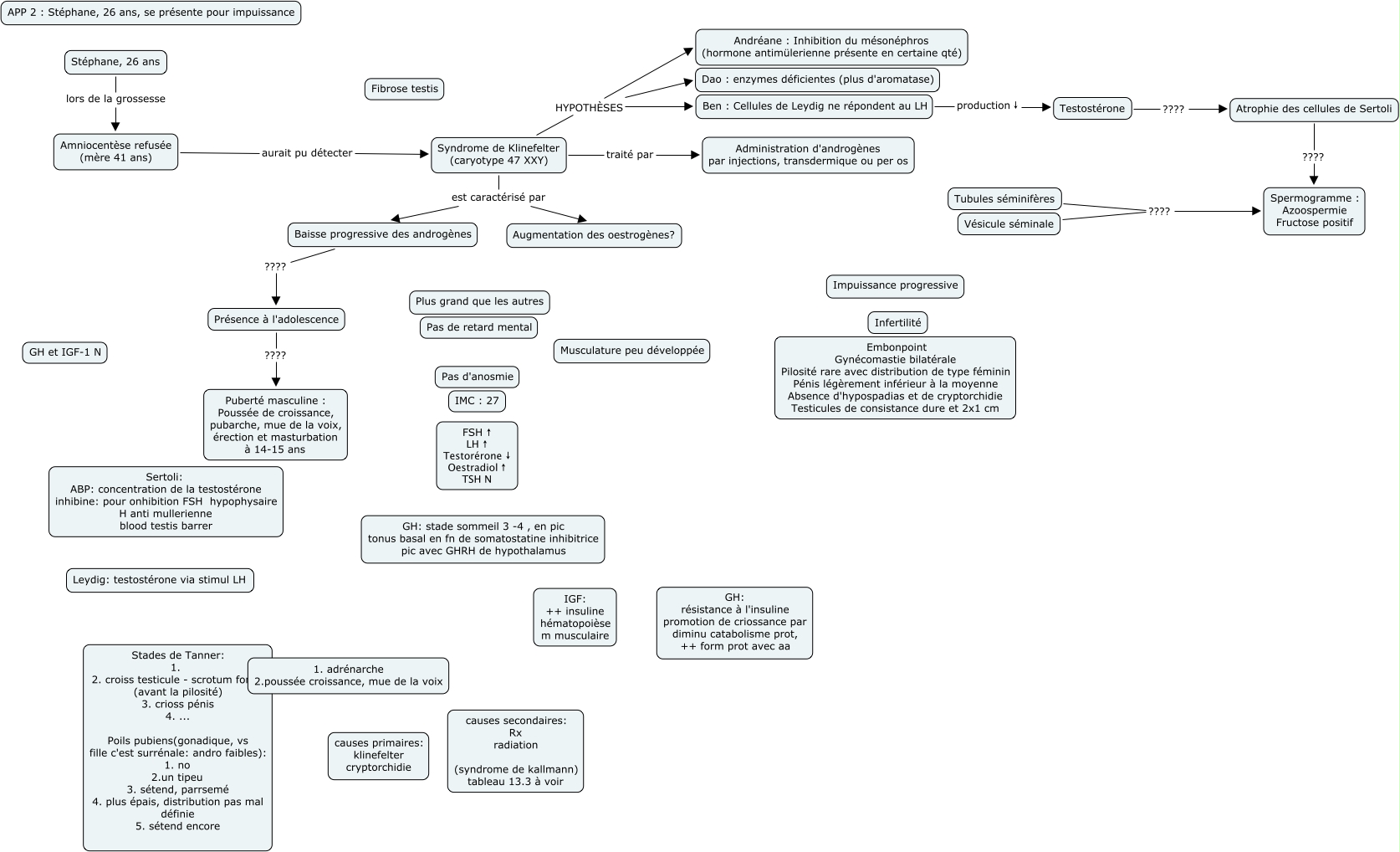 This Concept Map, created with IHMC CmapTools, has information related to: Untitled, Syndrome de Klinefelter (caryotype 47 XXY) traité par Administration d'androgènes par injections, transdermique ou per os, Vésicule séminale ???? Spermogramme : Azoospermie Fructose positif, Tubules séminifères ???? Spermogramme : Azoospermie Fructose positif, Atrophie des cellules de Sertoli ???? Spermogramme : Azoospermie Fructose positif, Baisse progressive des androgènes ???? Présence à l'adolescence, Présence à l'adolescence ???? Puberté masculine : Poussée de croissance, pubarche, mue de la voix, érection et masturbation à 14-15 ans, Stéphane, 26 ans lors de la grossesse Amniocentèse refusée (mère 41 ans), Amniocentèse refusée (mère 41 ans) aurait pu détecter Syndrome de Klinefelter (caryotype 47 XXY), Syndrome de Klinefelter (caryotype 47 XXY) HYPOTHÈSES Dao : enzymes déficientes (plus d'aromatase), Syndrome de Klinefelter (caryotype 47 XXY) est caractérisé par Baisse progressive des androgènes, Ben : Cellules de Leydig ne répondent au LH production ↓ Testostérone, Syndrome de Klinefelter (caryotype 47 XXY) HYPOTHÈSES Ben : Cellules de Leydig ne répondent au LH, Syndrome de Klinefelter (caryotype 47 XXY) est caractérisé par Augmentation des oestrogènes?, Syndrome de Klinefelter (caryotype 47 XXY) HYPOTHÈSES Andréane : Inhibition du mésonéphros (hormone antimülerienne présente en certaine qté), Testostérone ???? Atrophie des cellules de Sertoli