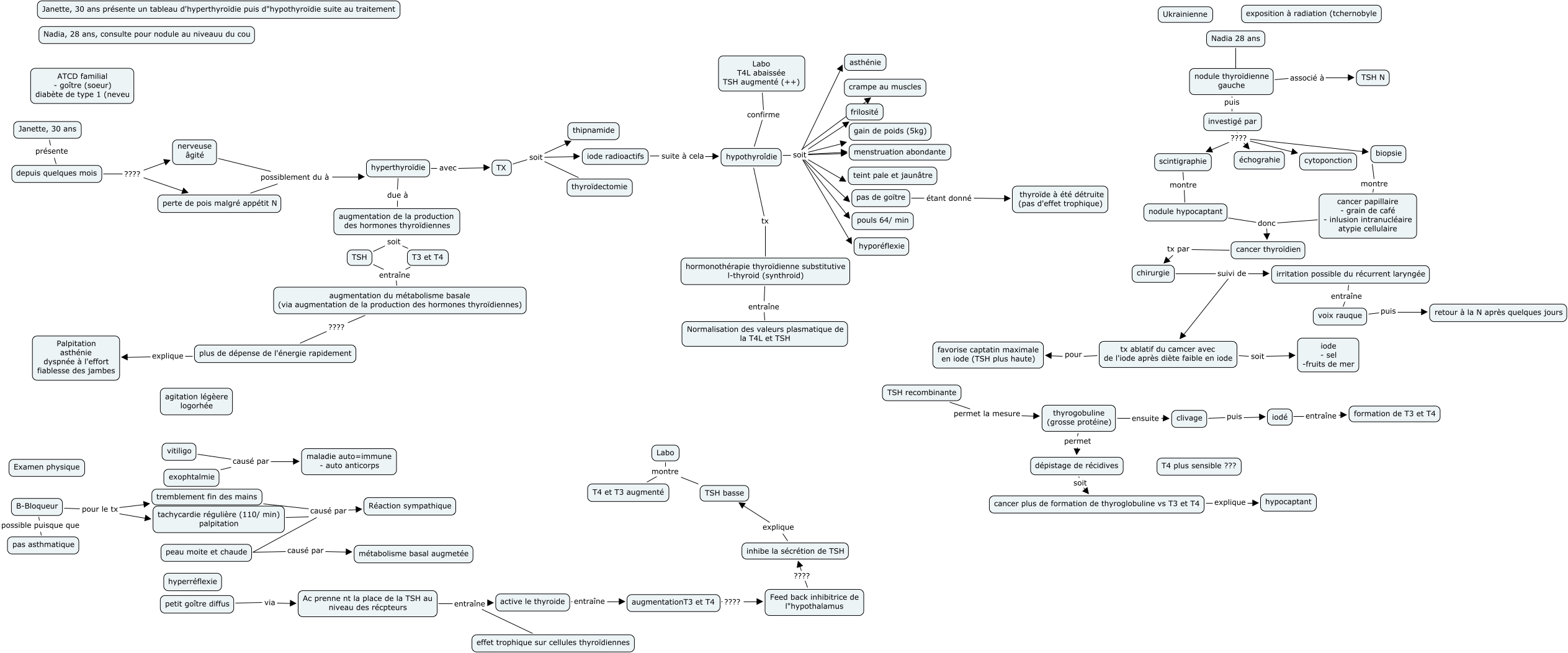 This Concept Map, created with IHMC CmapTools, has information related to: App3 aller, augmentationT3 et T4 ???? Feed back inhibitrice de l"hypothalamus, thyrogobuline (grosse protéine) permet dépistage de récidives, augmentation du métabolisme basale (via augmentation de la production des hormones thyroïdiennes) ???? plus de dépense de l'énergie rapidement, Feed back inhibitrice de l"hypothalamus ???? inhibe la sécrétion de TSH, irritation possible du récurrent laryngée entraîne voix rauque, nodule hypocaptant donc cancer thyroïdien, investigé par ???? biopsie, TX soit iode radioactifs, hyperthyroïdie due à augmentation de la production des hormones thyroïdiennes, nerveuse âgité possiblement du à hyperthyroïdie, depuis quelques mois ???? perte de pois malgré appétit N, hypothyroîdie soit frilosité, hypothyroîdie soit menstruation abondante, investigé par ???? cytoponction, plus de dépense de l'énergie rapidement explique Palpitation asthénie dyspnée à l'effort fiablesse des jambes, B-Bloqueur pour le tx tremblement fin des mains, T3 et T4 entraîne augmentation du métabolisme basale (via augmentation de la production des hormones thyroïdiennes), chirurgie suivi de irritation possible du récurrent laryngée, active le thyroide entraîne augmentationT3 et T4, Janette, 30 ans présente depuis quelques mois