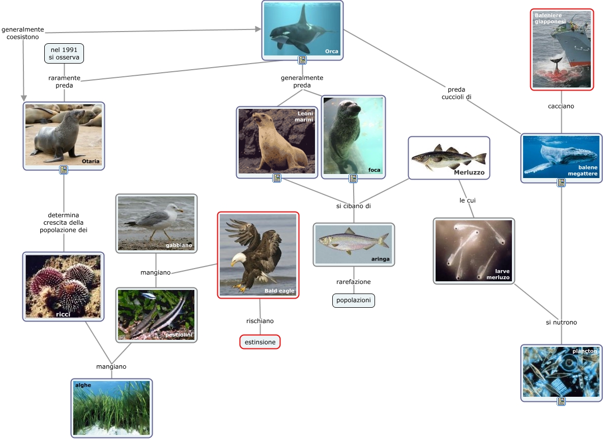 Questa Cmap, creata con IHMC CmapTools, contiene informazioni relative a: Rete ecologica marina, Orca generalmente preda foca, gabbiano mangiano pesciolini, balene megattere si nutrono plancton, Merluzzo le cui larve merluzo, pesciolini mangiano alghe, Orca raramente preda Otaria, Leoni marini si cibano di aringa, Bald eagle mangiano pesciolini, nel 1991 si osserva raramente preda Otaria, generalmente coesistono Otaria, Orca generalmente preda Leoni marini, Merluzzo si cibano di aringa, ricci mangiano alghe, Orca preda cuccioli di balene megattere, generalmente coesistono Orca, Bald eagle rischiano estinsione, aringa rarefazione popolazioni, foca si cibano di aringa, larve merluzo si nutrono plancton, Baleniere giapponesi cacciano balene megattere