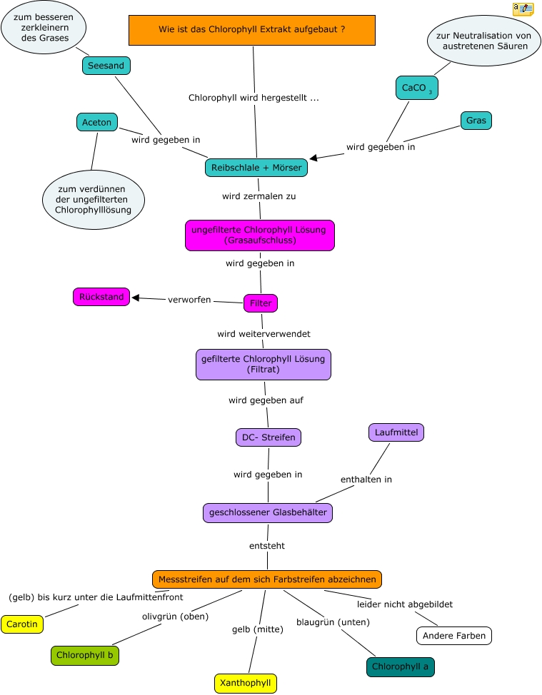 This Concept Map, created with IHMC CmapTools, has information related to: Chlorophyll Ole Daniel Marlon, Messstreifen auf dem sich Farbstreifen abzeichnen olivgrün (oben) Chlorophyll b, Messstreifen auf dem sich Farbstreifen abzeichnen gelb (mitte) Xanthophyll, Gras wird gegeben in Reibschlale + Mörser, zum verdünnen der ungefilterten Chlorophylllösung ???? Aceton, Reibschlale + Mörser wird zermalen zu ungefilterte Chlorophyll Lösung (Grasaufschluss), DC- Streifen wird gegeben in geschlossener Glasbehälter, Messstreifen auf dem sich Farbstreifen abzeichnen leider nicht abgebildet Andere Farben, geschlossener Glasbehälter entsteht Messstreifen auf dem sich Farbstreifen abzeichnen, Filter wird weiterverwendet gefilterte Chlorophyll Lösung (Filtrat), Filter verworfen Rückstand, zur Neutralisation von austretenen Säuren ???? <math xmlns="http://www.w3.org/1998/Math/MathML"> <mrow> <mtext> CaCO </mtext> <mmultiscripts> <mtext> </mtext> <mtext> 3 </mtext> <none/> </mmultiscripts> </mrow> </math>, zum besseren zerkleinern des Grases ???? Seesand, ungefilterte Chlorophyll Lösung (Grasaufschluss) wird gegeben in Filter, <math xmlns="http://www.w3.org/1998/Math/MathML"> <mrow> <mtext> CaCO </mtext> <mmultiscripts> <mtext> </mtext> <mtext> 3 </mtext> <none/> </mmultiscripts> </mrow> </math> wird gegeben in Reibschlale + Mörser, Wie ist das Chlorophyll Extrakt aufgebaut ? Chlorophyll wird hergestellt ... Reibschlale + Mörser, Seesand wird gegeben in Reibschlale + Mörser, Laufmittel enthalten in geschlossener Glasbehälter, Messstreifen auf dem sich Farbstreifen abzeichnen blaugrün (unten) Chlorophyll a, gefilterte Chlorophyll Lösung (Filtrat) wird gegeben auf DC- Streifen, Aceton wird gegeben in Reibschlale + Mörser