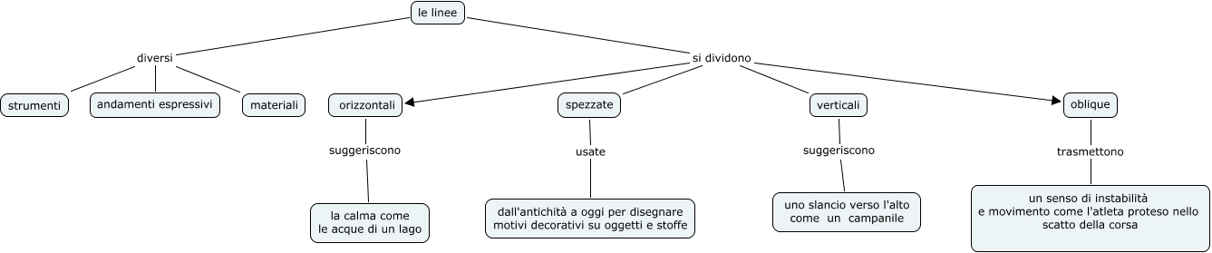 Questa Cmap, creata con IHMC CmapTools, contiene informazioni relative a: uso della linea, le linee diversi strumenti, le linee si dividono oblique, le linee si dividono spezzate, orizzontali suggeriscono la calma come le acque di un lago, le linee diversi materiali, verticali suggeriscono uno slancio verso l'alto come un campanile, le linee diversi andamenti espressivi, le linee si dividono verticali, oblique trasmettono un senso di instabilità e movimento come l'atleta proteso nello scatto della corsa, spezzate usate dall'antichità a oggi per disegnare motivi decorativi su oggetti e stoffe, le linee si dividono orizzontali