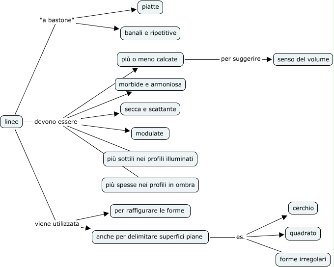 Questa Cmap, creata con IHMC CmapTools, contiene informazioni relative a: linee2, anche per delimitare superfici piane es. forme irregolari, anche per delimitare superfici piane es. quadrato, linee "a bastone" piatte, più o meno calcate per suggerire senso del volume, linee viene utilizzata anche per delimitare superfici piane, linee devono essere modulate, linee devono essere più sottili nei profili illuminati, linee "a bastone" banali e ripetitive, linee viene utilizzata per raffigurare le forme, linee devono essere più o meno calcate, linee devono essere più spesse nei profili in ombra, linee devono essere secca e scattante, anche per delimitare superfici piane es. cerchio, linee devono essere morbide e armoniosa