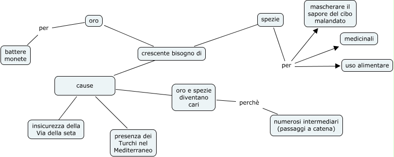 Questa Cmap, creata con IHMC CmapTools, contiene informazioni relative a: Cause approfondite, spezie per medicinali, cause ???? presenza dei Turchi nel Mediterraneo, oro per battere monete, crescente bisogno di ???? oro, oro e spezie diventano cari perchè numerosi intermediari (passaggi a catena), spezie per mascherare il sapore del cibo malandato, cause ???? crescente bisogno di, spezie per uso alimentare, crescente bisogno di ???? spezie, cause ???? oro e spezie diventano cari, cause insicurezza della Via della seta
