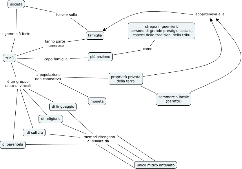 Questa Cmap, creata con IHMC CmapTools, contiene informazioni relative a: Tribù, tribù è un gruppo unito di vincoli di cultura, di linguaggio i membri ritengono di risalire da unico mitico antenato, commercio locale (baratto) apparteneva alla famiglia, tribù fanno parte numerose famiglia, tribù la popolazione non conosceva proprietà privata della terra, tribù è un gruppo unito di vincoli di religione, tribù è un gruppo unito di vincoli di parentela, proprietà privata della terra apparteneva alla famiglia, di linguaggio i membri ritengono di risalire da di parentela, tribù la popolazione non conosceva moneta, proprietà privata della terra ???? commercio locale (baratto), di cultura i membri ritengono di risalire da unico mitico antenato, società legame più forte tribù, di linguaggio i membri ritengono di risalire da unico mitico antenato, di linguaggio i membri ritengono di risalire da unico mitico antenato, società basate sulla famiglia, di linguaggio i membri ritengono di risalire da unico mitico antenato, tribù capo famiglia più anziano, tribù è un gruppo unito di vincoli di linguaggio, di cultura i membri ritengono di risalire da di parentela