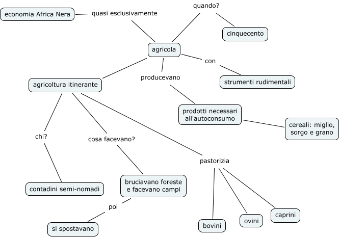 Questa Cmap, creata con IHMC CmapTools, contiene informazioni relative a: Economia africana, agricola ???? agricoltura itinerante, economia Africa Nera quasi esclusivamente agricola, agricola con strumenti rudimentali, prodotti necessari all'autoconsumo ???? cereali: miglio, sorgo e grano, agricoltura itinerante pastorizia ovini, agricoltura itinerante cosa facevano? bruciavano foreste e facevano campi, agricola quando? cinquecento, agricoltura itinerante chi? contadini semi-nomadi, agricoltura itinerante pastorizia caprini, agricola producevano prodotti necessari all'autoconsumo, bruciavano foreste e facevano campi poi si spostavano, agricoltura itinerante pastorizia bovini