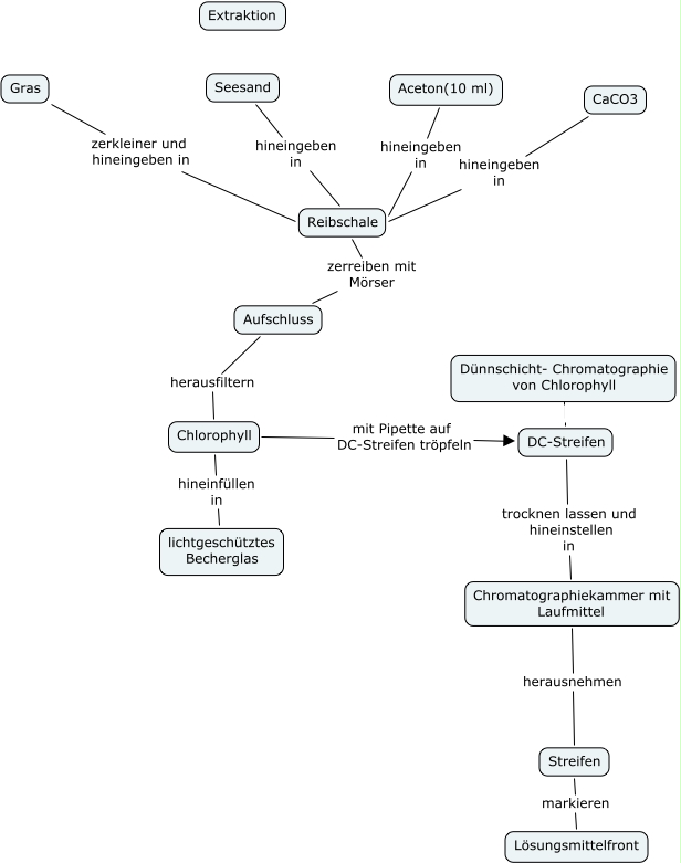 This Concept Map, created with IHMC CmapTools, has information related to: Extraktion, Dünnschicht- Chromatographie von Chlorophyll DC-Streifen, Chlorophyll hineinfüllen in lichtgeschütztes Becherglas, Gras zerkleiner und hineingeben in Reibschale, Reibschale zerreiben mit Mörser Aufschluss, Aceton(10 ml) hineingeben in Reibschale, Streifen markieren Lösungsmittelfront, DC-Streifen trocknen lassen und hineinstellen in Chromatographiekammer mit Laufmittel, Seesand hineingeben in Reibschale, Aufschluss herausfiltern Chlorophyll, CaCO3 hineingeben in Reibschale, Chromatographiekammer mit Laufmittel herausnehmen Streifen, Chlorophyll mit Pipette auf DC-Streifen tröpfeln DC-Streifen