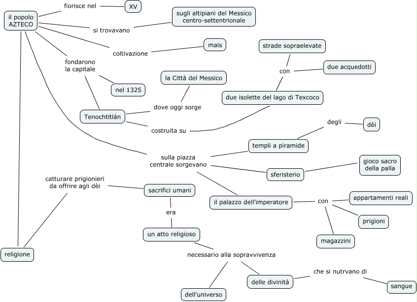 Questa Cmap, creata con IHMC CmapTools, contiene informazioni relative a: IL POPOLO AZTECO, due isolette del lago di Texcoco con strade sopraelevate, un atto religioso necessario alla sopravvivenza delle divinità, due isolette del lago di Texcoco con due acquedotti, sacrifici umani era un atto religioso, il palazzo dell'imperatore con prigioni, il popolo AZTECO fiorisce nel XV, templi a piramide degli dèi, il popolo AZTECO sulla piazza centrale sorgevano sferisterio, Tenochtitlán dove oggi sorge la Città del Messico, delle divinità che si nutrvano di sangue, il popolo AZTECO sulla piazza centrale sorgevano templi a piramide, religione catturare prigionieri da offrire agli dèi sacrifici umani, il popolo AZTECO coltivazione mais, il popolo AZTECO fondarono la capitale nel 1325, Tenochtitlán costruita su due isolette del lago di Texcoco, il popolo AZTECO si trovavano sugli altipiani del Messico centro-settentrionale, il popolo AZTECO sulla piazza centrale sorgevano il palazzo dell'imperatore, il palazzo dell'imperatore con appartamenti reali, sferisterio ???? gioco sacro della palla, il popolo AZTECO ???? religione
