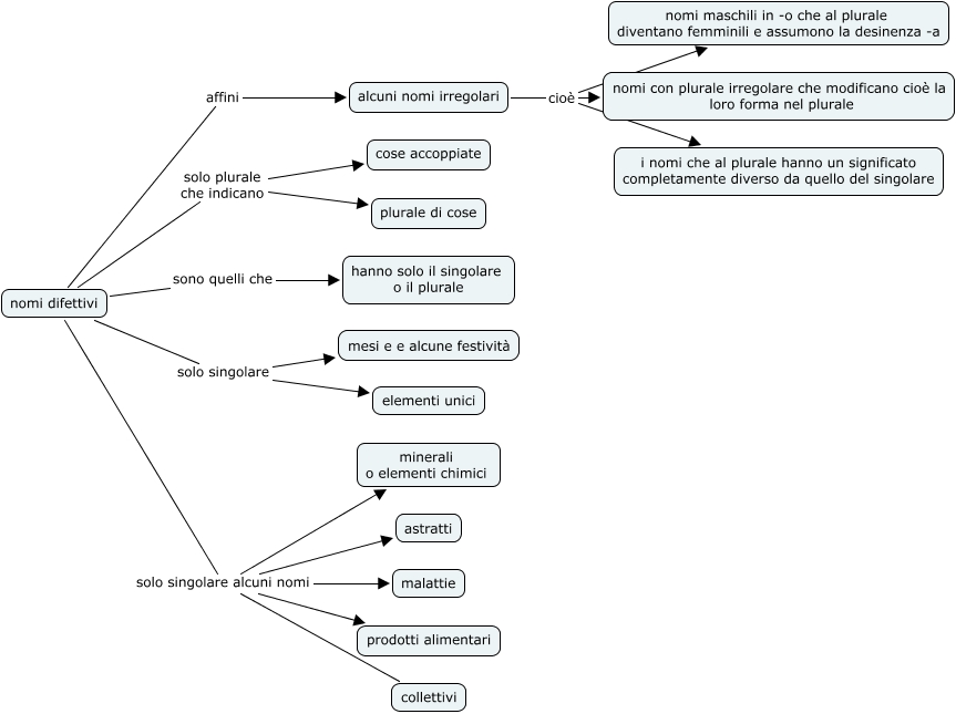Questa Cmap, creata con IHMC CmapTools, contiene informazioni relative a: nomi difettivi, nomi difettivi solo singolare alcuni nomi malattie, nomi difettivi solo singolare alcuni nomi collettivi, nomi difettivi solo singolare alcuni nomi prodotti alimentari, nomi difettivi affini alcuni nomi irregolari, nomi difettivi solo plurale che indicano plurale di cose, nomi difettivi solo singolare elementi unici, nomi difettivi solo plurale che indicano cose accoppiate, nomi difettivi sono quelli che hanno solo il singolare o il plurale, alcuni nomi irregolari cioè nomi maschili in -o che al plurale diventano femminili e assumono la desinenza -a, alcuni nomi irregolari cioè i nomi che al plurale hanno un significato completamente diverso da quello del singolare, alcuni nomi irregolari cioè nomi con plurale irregolare che modificano cioè la loro forma nel plurale, nomi difettivi solo singolare alcuni nomi minerali o elementi chimici, nomi difettivi solo singolare mesi e e alcune festività, nomi difettivi solo singolare alcuni nomi astratti