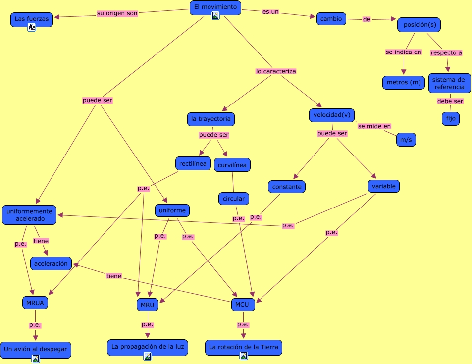 Este mapa conceptual tiene información relacionada a: El movimiento, El movimiento es un cambio, variable p.e. MCU, velocidad(v) se mide en m/s, sistema de referencia debe ser fijo, El movimiento puede ser uniforme, MRU p.e. La propagación de la luz, velocidad(v) puede ser constante, MCU tiene aceleración, rectilínea p.e. MRUA, rectilínea p.e. MRU, uniformemente acelerado tiene aceleración, circular p.e. MCU, la trayectoria puede ser rectilínea, constante p.e. MRU, posición(s) respecto a sistema de referencia, variable p.e. uniformemente acelerado, uniforme p.e. MCU, MRUA p.e. Un avión al despegar, El movimiento lo caracteriza velocidad(v), El movimiento puede ser uniformemente acelerado