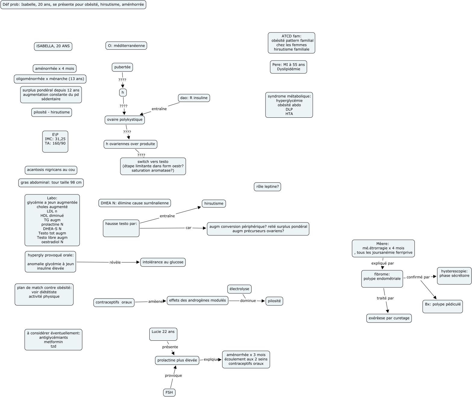 This Concept Map, created with IHMC CmapTools, has information related to: aller APP5, fibrome: polype endométriale confirmé par hysterescopie: phase sécrétoire, fibrome: polype endométriale confirmé par Bx: polype pédiculé, pubertée ???? h, h ovariennes over produite ???? switch vers testo (étape limitante dans form oestr? saturation aromatase?), FSH provoque prolactine plus élevée, hausse testo par: entraîne hirsutisme, fibrome: polype endométriale traité par exérèese par curetage, dao: R insuline entraîne ovaire polykystique, ovaire polykystique ???? h ovariennes over produite, électrolyse dominue pilosité, hypergly provoqué orale: anomalie glycémie à jeun insuline élevée révèle intolérance au glucose, Mèere: mé.étrorragie x 4 mois , tous les joursanémie ferriprive expliqué par fibrome: polype endométriale, contraceptifs oraux amèene effets des androgènes modulés, prolactine plus élevée explqiue aménorrhée x 3 mois écoulement aux 2 seins contraceptifs oraux, h ???? ovaire polykystique, effets des androgènes modulés dominue pilosité, Lucie 22 ans présente prolactine plus élevée, hausse testo par: car augm conversion périphérique? relié surplus pondéral augm précurseurs ovariens?