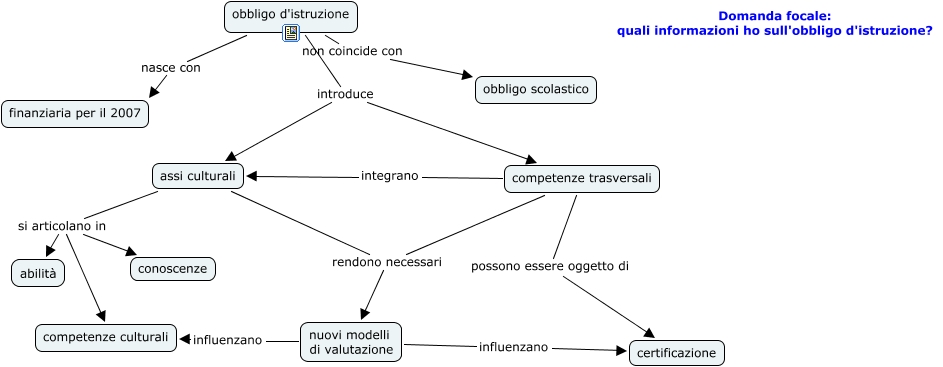 Questa Cmap, creata con IHMC CmapTools, contiene informazioni relative a: obbligo d'istruzione 7, obbligo d'istruzione introduce assi culturali, assi culturali si articolano in conoscenze, obbligo d'istruzione non coincide con obbligo scolastico, competenze trasversali rendono necessari nuovi modelli di valutazione, assi culturali rendono necessari nuovi modelli di valutazione, nuovi modelli di valutazione influenzano certificazione, obbligo d'istruzione nasce con finanziaria per il 2007, competenze trasversali possono essere oggetto di certificazione, competenze trasversali integrano assi culturali, nuovi modelli di valutazione influenzano competenze culturali, assi culturali si articolano in abilità, obbligo d'istruzione introduce competenze trasversali, assi culturali si articolano in competenze culturali