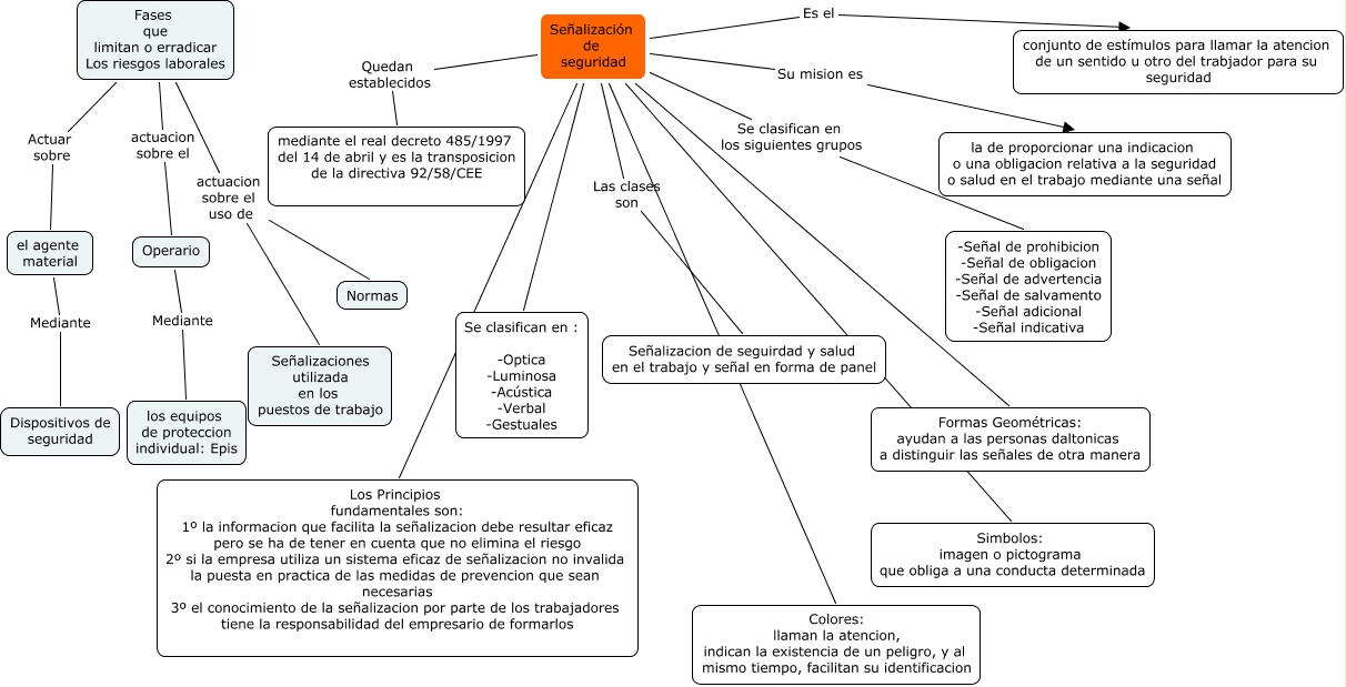 Este mapa conceptual tiene información relacionada a: Mapa conceptual 2, Señalización de seguridad Los Principios fundamentales son: 1º la informacion que facilita la señalizacion debe resultar eficaz pero se ha de tener en cuenta que no elimina el riesgo 2º si la empresa utiliza un sistema eficaz de señalizacion no invalida la puesta en practica de las medidas de prevencion que sean necesarias 3º el conocimiento de la señalizacion por parte de los trabajadores tiene la responsabilidad del empresario de formarlos, Operario Mediante los equipos de proteccion individual: Epis, Señalización de seguridad Es el conjunto de estímulos para llamar la atencion de un sentido u otro del trabjador para su seguridad, Señalización de seguridad Formas Geométricas: ayudan a las personas daltonicas a distinguir las señales de otra manera, Fases que limitan o erradicar Los riesgos laborales actuacion sobre el uso de Señalizaciones utilizada en los puestos de trabajo, Señalización de seguridad Colores: llaman la atencion, indican la existencia de un peligro, y al mismo tiempo, facilitan su identificacion, Señalización de seguridad Su mision es la de proporcionar una indicacion o una obligacion relativa a la seguridad o salud en el trabajo mediante una señal, Señalización de seguridad Simbolos: imagen o pictograma que obliga a una conducta determinada, Fases que limitan o erradicar Los riesgos laborales actuacion sobre el uso de Normas, Señalización de seguridad Se clasifican en los siguientes grupos -Señal de prohibicion -Señal de obligacion -Señal de advertencia -Señal de salvamento -Señal adicional -Señal indicativa, el agente material Mediante Dispositivos de seguridad, Señalización de seguridad Quedan establecidos mediante el real decreto 485/1997 del 14 de abril y es la transposicion de la directiva 92/58/CEE, Fases que limitan o erradicar Los riesgos laborales Actuar sobre el agente material, Señalización de seguridad Las clases son Señalizacion de seguirdad y salud en el trabajo y señal en forma de panel, Señalización de seguridad Se clasifican en : -Optica -Luminosa -Acústica -Verbal -Gestuales, Fases que limitan o erradicar Los riesgos laborales actuacion sobre el Operario