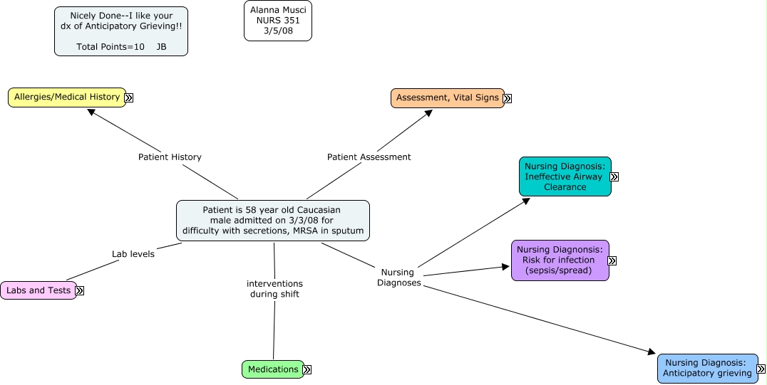 This Concept Map, created with IHMC CmapTools, has information related to: Acute Care 3.05.08, Patient is 58 year old Caucasian male admitted on 3/3/08 for difficulty with secretions, MRSA in sputum Nursing Diagnoses Nursing Diagnosis: Ineffective Airway Clearance, Provide open environment and trust between patient to allow expression. Be honest when answering questions and explainging information. outcome Patient seemed tired and unwilling to communicate. It seemed like an increased effort for him to communicate so he did not try to keep long conversations., Loperamide 2mg PEG q4h (1800) used for Decrease Diarrhea, Assessment G/U Foley catheter urine yellow,clear Output: *i did not write it down, Ineffective airway clearance related to excessive sputum production as evidenced by rhonchi, ineffective cough interventions Assess for signs of respiratory distress, Assessment Neuro/muscular Alert and Oriented x3 Muscle Strength: 5 BUE, 4 BLE, Out of bed with walker Mouths words or writes down, Discuss understanding of control: what is in the power of the patient to change and what is beyond control. interventions Refer patient to other resources such as pastoral care, support/grief counseling, Administer bactericidal medication checking right route, time outcome Patient received medications on time. No adverse reactions, Assessment Vital Signs Vitals q2h 1400 Temp:36.2C Pulse: 92 Resp: 16 B/P: 101/70 O2: 99% Trach collar Pain: 0/10, Metoprolol tab 12.5mg PEG BID (2100) used for Decrease BP and HR, Change dressing on wound as ordered. Assess drainage type, healing and skin integrity around the wounds outcome Dry sterile dressing placed over lesions on neck. The two larger ones were packed with dry nu gauze., Discuss understanding of control: what is in the power of the patient to change and what is beyond control. interventions Provide open environment and trust between patient to allow expression. Be honest when answering questions and explainging information., Risk for Infection (sepsis/spread) related to MRSA infection, and possible C-diff infection Interventions Change dressing on wound as ordered. Assess drainage type, healing and skin integrity around the wounds, Assessment Respiratory Lung sounds: Rhonchi in all lung fields symmetrical chest rise Trach- Shiley, size 6 lots of yellow/clear sputum productive cough suctioned x2/shift Trach collar, Fi02: 0.35 MRSA in sputum Droplet Precautions, Anticipatory grieving related to CA and deteriorating physiologic condition as evidenced by patient passivity, sorrowful expression, passively allowing care or often refusing, such as refusing vital signs or suctioning, isolaion/withdrawal Expected Outcome Patient will recognize and express feelings freely. Patient will involve self in and control self care. Patient will use effective coping mechanisms, Vancomycin 250mg PEG q8h (1800) use Bactericidal for Streptococcui, Staphylococci Clostridium, Risk for Infection (sepsis/spread) related to MRSA infection, and possible C-diff infection Interventions Assess for signs and symptoms of progressing infection: increase temp, increased WBC, decreased tissue perfusion, Ineffective airway clearance related to excessive sputum production as evidenced by rhonchi, ineffective cough interventions Provide trach care every shift and as needed, Patient will recognize and express feelings freely. Patient will involve self in and control self care. Patient will use effective coping mechanisms interventions Provide open environment and trust between patient to allow expression. Be honest when answering questions and explainging information., Assess respiratory rate rhythm and breath sounds during shift outcome Patient's respiratory rate and SaO2 within normal limits Breath sounds rhonchi in all fields. Coughing excessive mucus