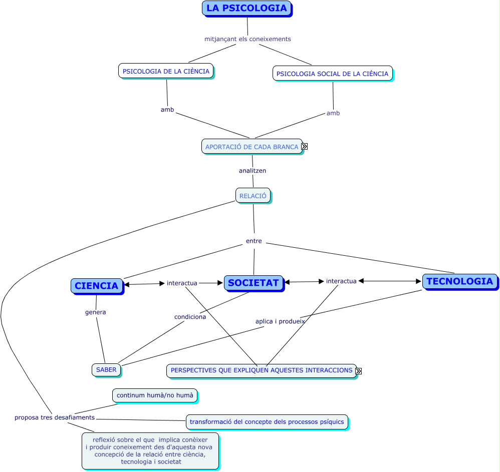 Este Cmap, tiene información relacionada con: mapa1, RELACIÓ entre SOCIETAT, CIENCIA interactua PERSPECTIVA SEAMLESS WEB, SOCIETAT interactua PERSPECTIVA INTERACTIVA, PSICOLOGIA DE LA CIÈNCIA amb APORTACIÓ DE CADA BRANCA, APORTACIÓ DE CADA BRANCA analitzen RELACIÓ, RELACIÓ entre TECNOLOGIA, RELACIÓ proposa tres desafiaments transformació del concepte dels processos psíquics, CIENCIA interactua SOCIETAT, RELACIÓ entre CIENCIA, TECNOLOGIA aplica i produeix SABER, RELACIÓ proposa tres desafiaments continum humà/no humà, SOCIETAT interactua TECNOLOGIA, LA PSICOLOGIA mitjançant els coneixements PSICOLOGIA SOCIAL DE LA CIÈNCIA, PSICOLOGIA SOCIAL DE LA CIÈNCIA amb APORTACIÓ DE CADA BRANCA, CIENCIA genera SABER, RELACIÓ proposa tres desafiaments reflexió sobre el que implica conèixer i produir coneixement des d'aquesta nova concepció de la relació entre ciència, tecnologia i societat, SABER condiciona SOCIETAT, LA PSICOLOGIA mitjançant els coneixements PSICOLOGIA DE LA CIÈNCIA