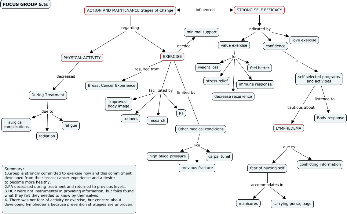 This Concept Map, created with IHMC CmapTools, has information related to: Focus Group 5.ts, self selected programs and activities cautious about LYMPHEDEMA, EXERCISE facilitated by PT, During Treatment due to fatigue, value exercise for weight loss, value exercise for stress relief, ACTION AND MAINTENANCE Stages of Change regarding EXERCISE, EXERCISE resulted from Breast Cancer Experience, STRONG SELF EFFICACY indicated by value exercise, value exercise for immune response, value exercise for feel better, Other medical conditions like high blood pressure, Other medical conditions like carpal tunel, LYMPHEDEMA due to conflicting information, EXERCISE facilitated by improved body image, During Treatment due to surgical complications, STRONG SELF EFFICACY indicated by love exercise, value exercise for decrease recurrence, fear of hurting self accommodates in carrying purse, bags, fear of hurting self accommodates in manicures, LYMPHEDEMA due to fear of hurting self