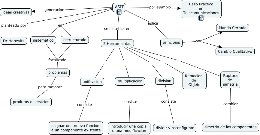 Questa Cmap, creata con IHMC CmapTools, contiene informazioni relative a: ASIT, sistematico focalizado problemas, ASIT se sintetiza en 5 Herramientas, ASIT planteado por Dr Horowitz, Ruptura de simetria cambiar simetria de los componentes, division consiste dividir y reconfigurar, principios son Cambio Cualitativo, 5 Herramientas Ruptura de simetria, problemas para mejorar produtos o servicios, ASIT aplica principios, 5 Herramientas unificacion, ASIT por ejemplo Caso Practico en Telecomunicaciones, estructurado focalizado problemas, 5 Herramientas multiplicacion, unificacion consiste asignar una nueva funcion a un componente existente, ASIT es estructurado, principios son Mundo Cerrado, multiplicacion consiste introducir una copia o una modificacion, 5 Herramientas division, ASIT generacion ideas creativas, ASIT es sistematico
