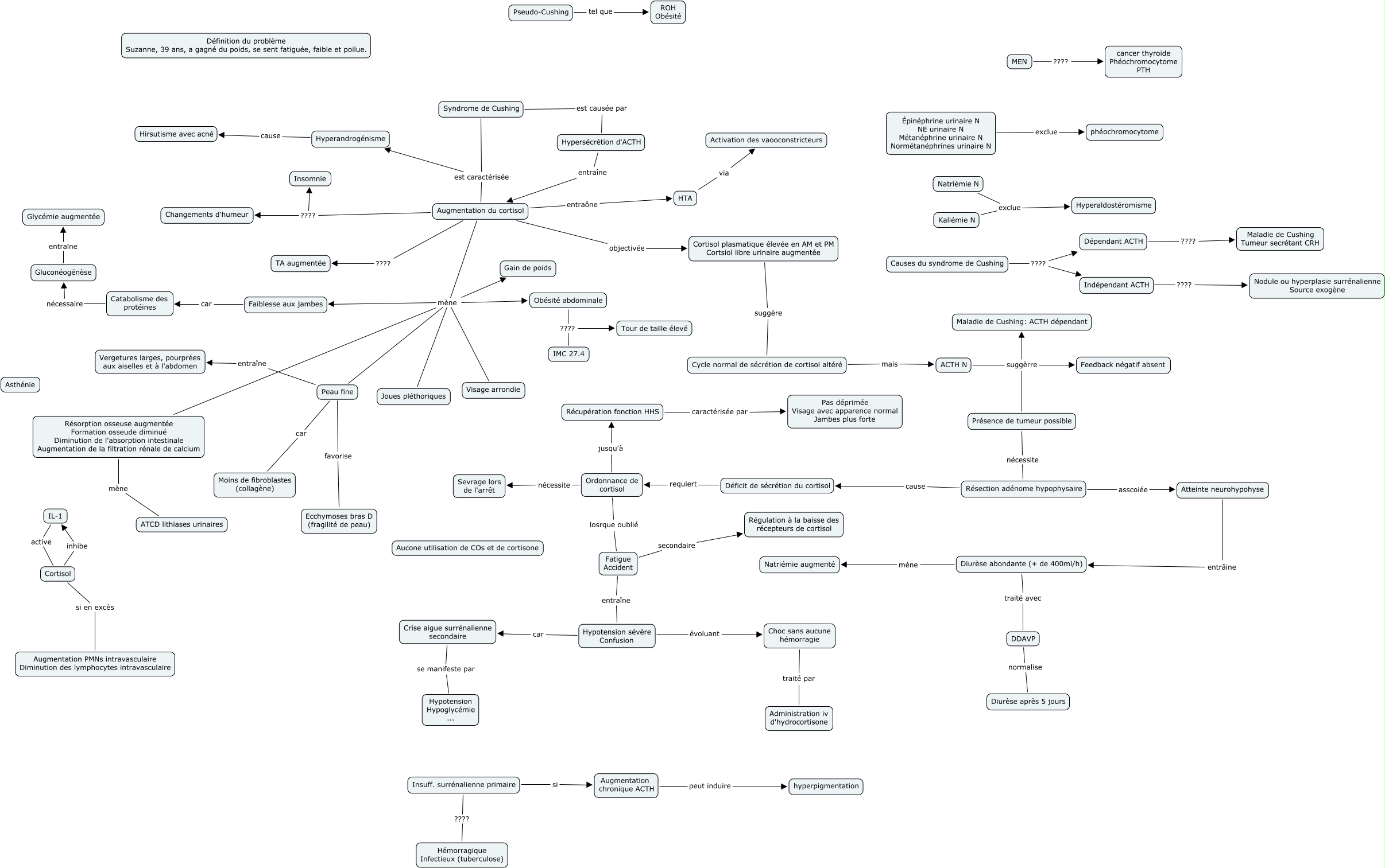 This Concept Map, created with IHMC CmapTools, has information related to: APP6-aller, Peau fine favorise Ecchymoses bras D (fragilité de peau), Syndrome de Cushing est caractérisée Hyperandrogénisme, IL-1 active Cortisol, Augmentation du cortisol mène Peau fine, Augmentation du cortisol mène Gain de poids, Hypersécrétion d'ACTH entraîne Augmentation du cortisol, Obésité abdominale ???? Tour de taille élevé, Syndrome de Cushing est causée par Hypersécrétion d'ACTH, Augmentation du cortisol objectivée Cortisol plasmatique élevée en AM et PM Cortsiol libre urinaire augmentée, Kaliémie N exclue Hyperaldostéromisme, Augmentation du cortisol ???? TA augmentée, Catabolisme des protéines nécessaire Gluconéogénèse, Pseudo-Cushing tel que ROH Obésité, Crise aigue surrénalienne secondaire se manifeste par Hypotension Hypoglycémie ..., ACTH N suggèrre Maladie de Cushing: ACTH dépendant, Récupération fonction HHS caractérisée par Pas déprimée Visage avec apparence normal Jambes plus forte, Dépendant ACTH ???? Maladie de Cushing Tumeur secrétant CRH, Cortisol plasmatique élevée en AM et PM Cortsiol libre urinaire augmentée suggère Cycle normal de sécrétion de cortisol altéré, Présence de tumeur possible nécessite Résection adénome hypophysaire, Causes du syndrome de Cushing ???? Dépendant ACTH