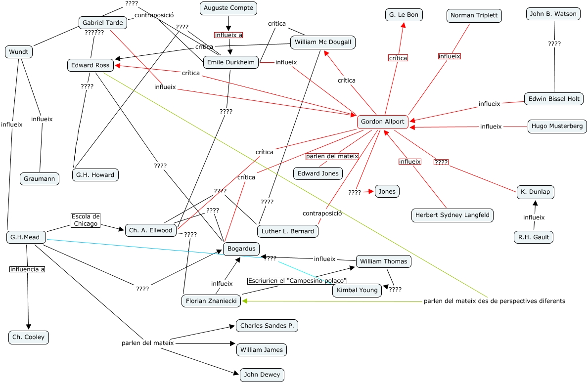 Este Cmap, tiene información relacionada con: Orígens psicologia social, G.H.Mead Escola de Chicago Ch. A. Ellwood, Gordon Allport crítica Bogardus, Gordon Allport ???? K. Dunlap, R.H. Gault influeix K. Dunlap, Auguste Compte influeix a Emile Durkheim, Wundt influeix Graumann, Norman Triplett influeix Gordon Allport, Herbert Sydney Langfeld influeix Gordon Allport, Gabriel Tarde influeix Gordon Allport, Ch. A. Ellwood ???? Bogardus, Gordon Allport parlen del mateix Edward Jones, William Thomas influeix Bogardus, Gabriel Tarde contraposició Emile Durkheim, Gordon Allport crítica William Mc Dougall, G.H.Mead ???? Bogardus, G.H.Mead ???? Kimbal Young, William Mc Dougall crítica Emile Durkheim, Florian Znaniecki inlfueix Bogardus, Gordon Allport ???? Jones, Wundt influeix G.H.Mead