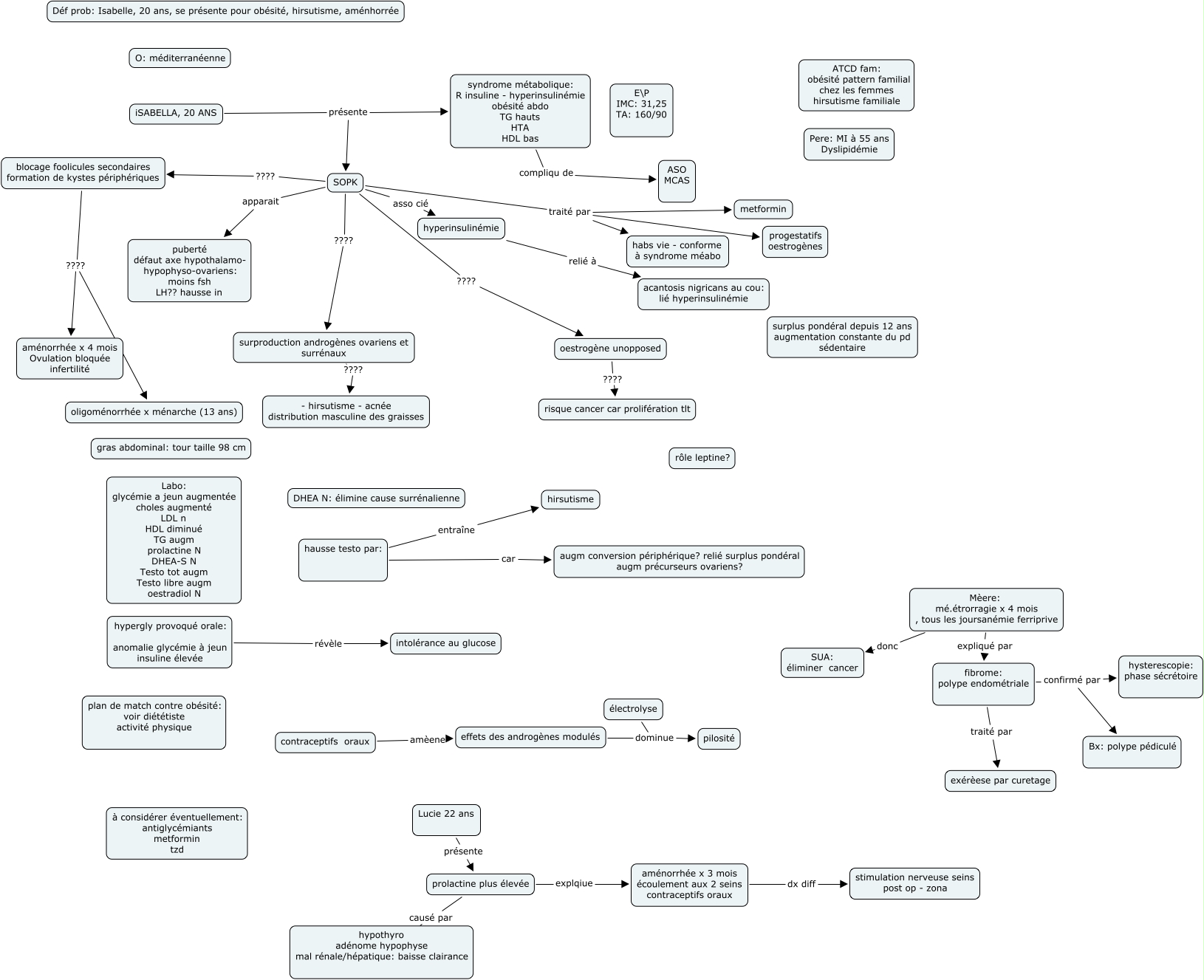 This Concept Map, created with IHMC CmapTools, has information related to: APP5, Mèere: mé.étrorragie x 4 mois , tous les joursanémie ferriprive expliqué par fibrome: polype endométriale, blocage foolicules secondaires formation de kystes périphériques ???? oligoménorrhée x ménarche (13 ans), Mèere: mé.étrorragie x 4 mois , tous les joursanémie ferriprive donc SUA: éliminer cancer, hypergly provoqué orale: anomalie glycémie à jeun insuline élevée révèle intolérance au glucose, fibrome: polype endométriale confirmé par hysterescopie: phase sécrétoire, hausse testo par: entraîne hirsutisme, iSABELLA, 20 ANS présente syndrome métabolique: R insuline - hyperinsulinémie obésité abdo TG hauts HTA HDL bas, SOPK ???? surproduction androgènes ovariens et surrénaux, aménorrhée x 3 mois écoulement aux 2 seins contraceptifs oraux dx diff stimulation nerveuse seins post op - zona, SOPK ???? oestrogène unopposed, hausse testo par: car augm conversion périphérique? relié surplus pondéral augm précurseurs ovariens?, SOPK traité par habs vie - conforme à syndrome méabo, prolactine plus élevée causé par hypothyro adénome hypophyse mal rénale/hépatique: baisse clairance, SOPK apparait puberté défaut axe hypothalamo- hypophyso-ovariens: moins fsh LH?? hausse in, effets des androgènes modulés dominue pilosité, blocage foolicules secondaires formation de kystes périphériques ???? aménorrhée x 4 mois Ovulation bloquée infertilité, hyperinsulinémie relié à acantosis nigricans au cou: lié hyperinsulinémie, électrolyse dominue pilosité, oestrogène unopposed ???? risque cancer car prolifération tlt, SOPK traité par progestatifs oestrogènes