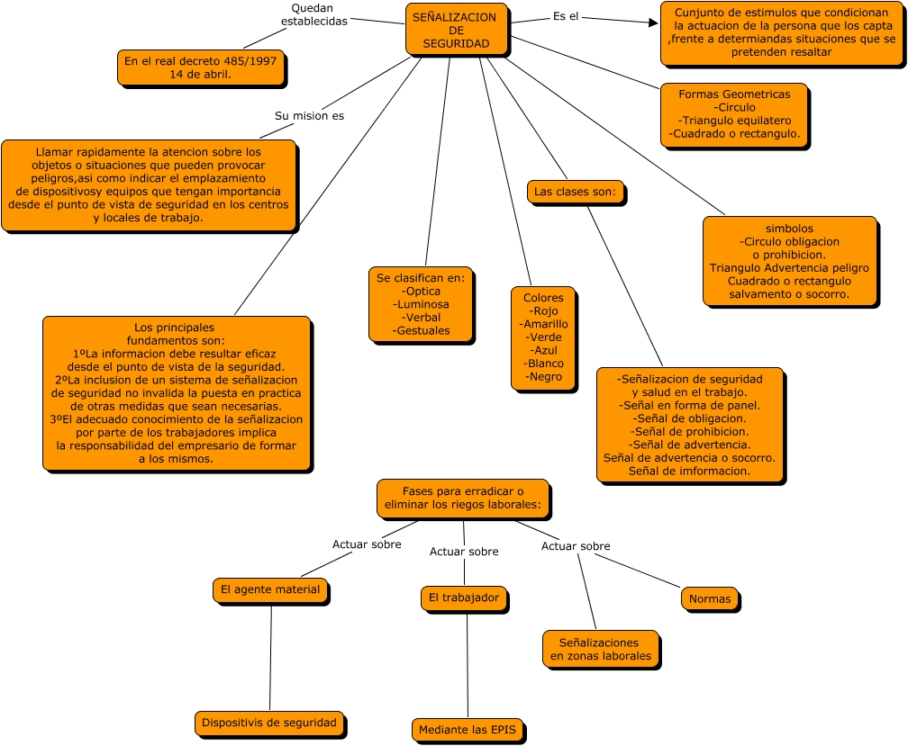 Este mapa conceptual tiene información relacionada a: TRABAJOOO 11111, SEÑALIZACION DE SEGURIDAD Su mision es Llamar rapidamente la atencion sobre los objetos o situaciones que pueden provocar peligros,asi como indicar el emplazamiento de dispositivosy equipos que tengan importancia desde el punto de vista de seguridad en los centros y locales de trabajo., SEÑALIZACION DE SEGURIDAD ???? Formas Geometricas -Circulo -Triangulo equilatero -Cuadrado o rectangulo., Fases para erradicar o eliminar los riegos laborales: Actuar sobre Normas, Las clases son: ???? -Señalizacion de seguridad y salud en el trabajo. -Señal en forma de panel. -Señal de obligacion. -Señal de prohibicion. -Señal de advertencia. Señal de advertencia o socorro. Señal de imformacion., SEÑALIZACION DE SEGURIDAD ???? Las clases son:, Fases para erradicar o eliminar los riegos laborales: Actuar sobre Señalizaciones en zonas laborales, El trabajador ???? Mediante las EPIS, Fases para erradicar o eliminar los riegos laborales: Actuar sobre El trabajador, SEÑALIZACION DE SEGURIDAD ???? Se clasifican en: -Optica -Luminosa -Verbal -Gestuales, SEÑALIZACION DE SEGURIDAD ???? Colores -Rojo -Amarillo -Verde -Azul -Blanco -Negro, SEÑALIZACION DE SEGURIDAD ???? Los principales fundamentos son: 1ºLa informacion debe resultar eficaz desde el punto de vista de la seguridad. 2ºLa inclusion de un sistema de señalizacion de seguridad no invalida la puesta en practica de otras medidas que sean necesarias. 3ºEl adecuado conocimiento de la señalizacion por parte de los trabajadores implica la responsabilidad del empresario de formar a los mismos., SEÑALIZACION DE SEGURIDAD Quedan establecidas En el real decreto 485/1997 14 de abril., SEÑALIZACION DE SEGURIDAD Es el Cunjunto de estimulos que condicionan la actuacion de la persona que los capta ,frente a determiandas situaciones que se pretenden resaltar, Fases para erradicar o eliminar los riegos laborales: Actuar sobre El agente material, SEÑALIZACION DE SEGURIDAD ???? simbolos -Circulo obligacion o prohibicion. Triangulo Advertencia peligro Cuadrado o rectangulo salvamento o socorro., El agente material Dispositivis de seguridad
