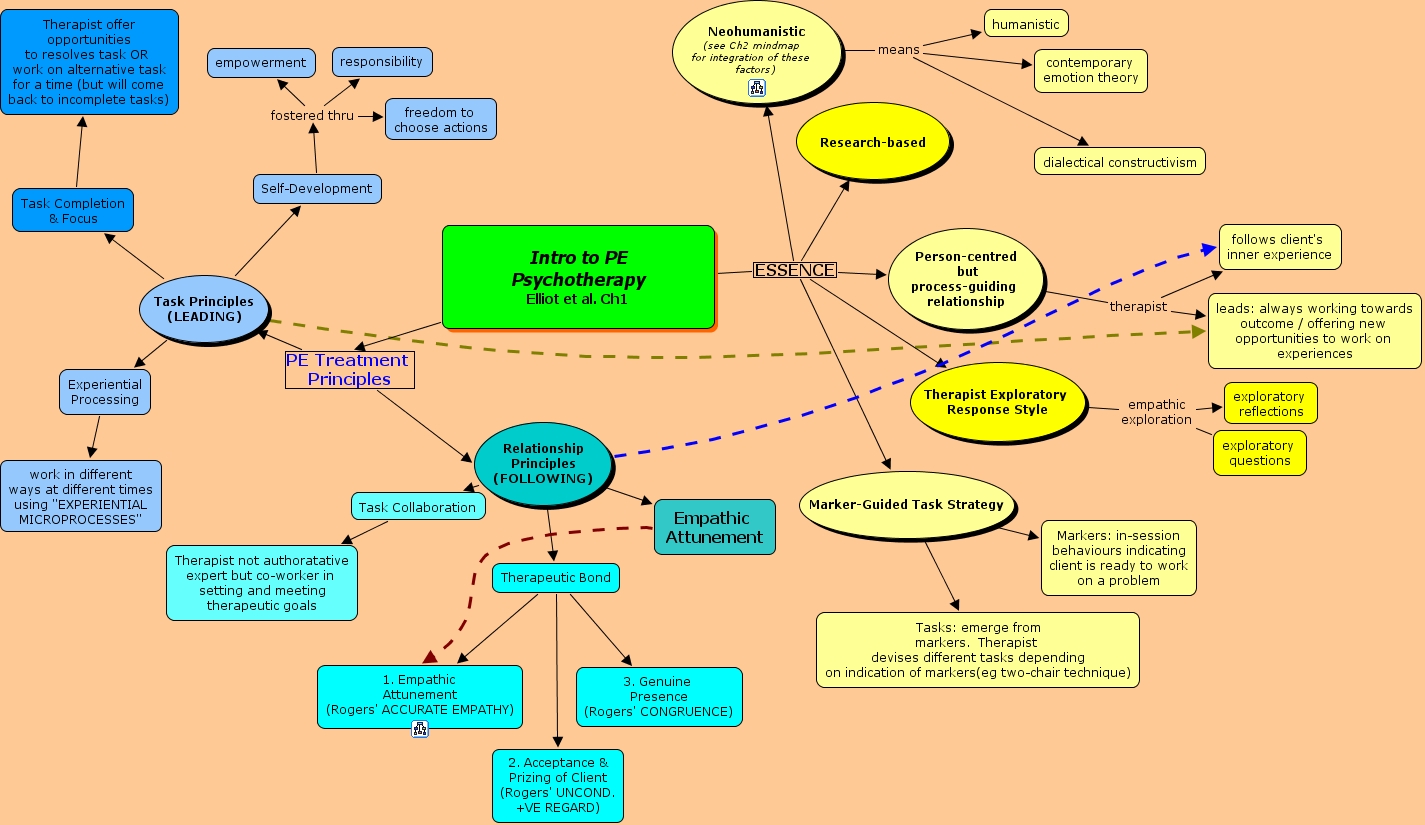 Intro to PE Psychotherapy, Neohumanistic (see Ch2 mindmap for integration of these factors) means dialectical constructivism, Task Completion & Focus Therapist offer opportunities to resolves task OR work on alternative task for a time (but will come back to incomplete tasks), Neohumanistic (see Ch2 mindmap for integration of these factors) means humanistic, Therapist Exploratory Response Style empathic exploration exploratory questions, Marker-Guided Task Strategy Tasks: emerge from markers. Therapist devises different tasks depending on indication of markers(eg two-chair technique), Relationship Principles (FOLLOWING) Empathic Attunement, Intro to PE Psychotherapy Elliot et al. Ch1 PE Treatment Principles Relationship Principles (FOLLOWING), Self-Development fostered thru responsibility, Task Principles (LEADING) Task Completion & Focus, Therapist Exploratory Response Style empathic exploration exploratory reflections