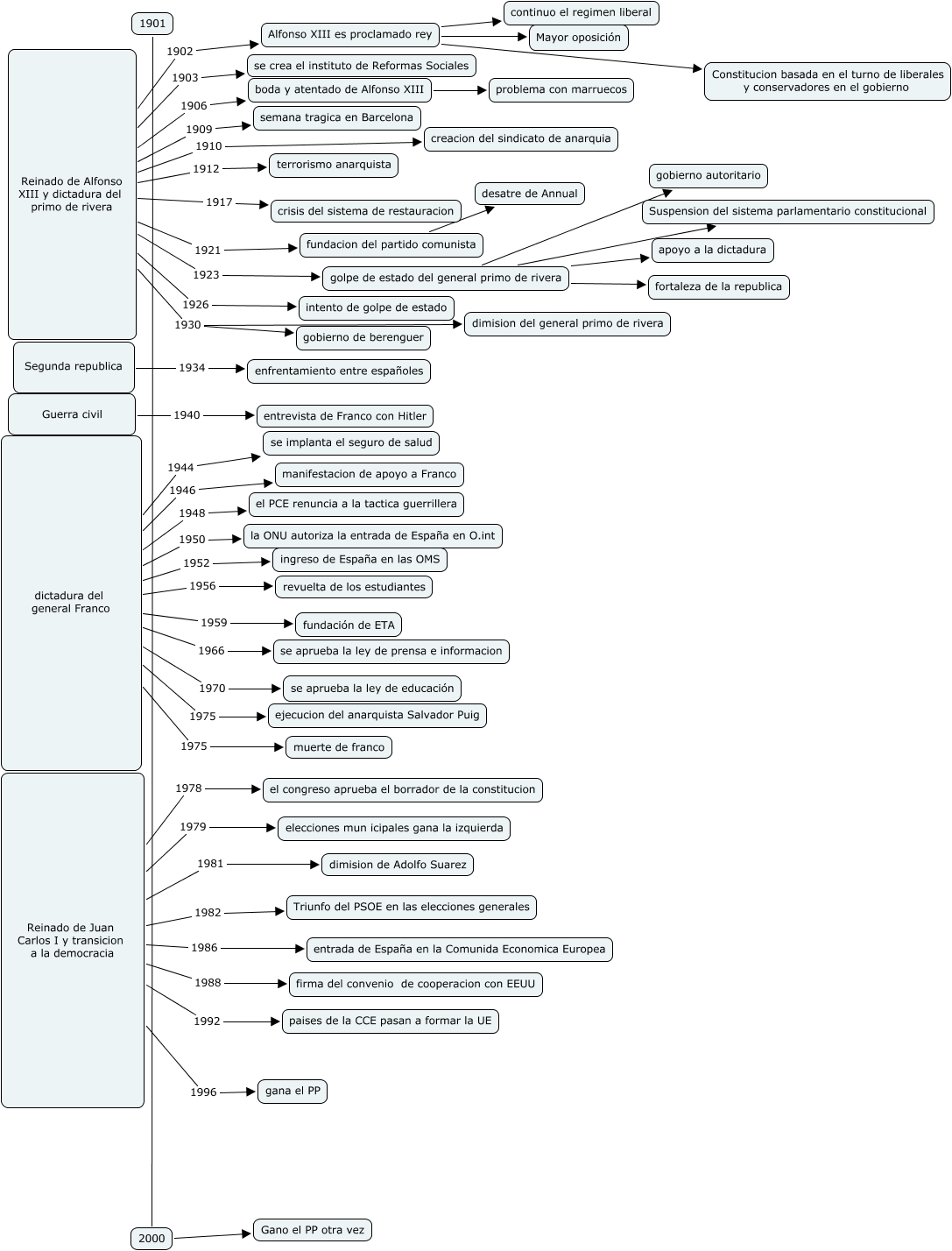 Este Cmap, tiene información relacionada con: 02.adolfo avila ruiz.España S XX, golpe de estado del general primo de rivera Suspension del sistema parlamentario constitucional, dictadura del general Franco 1966 se aprueba la ley de prensa e informacion, Reinado de Juan Carlos I y transicion a la democracia 1982 Triunfo del PSOE en las elecciones generales, Reinado de Alfonso XIII y dictadura del primo de rivera 1906 boda y atentado de Alfonso XIII, Reinado de Alfonso XIII y dictadura del primo de rivera 1912 terrorismo anarquista, dictadura del general Franco 1970 se aprueba la ley de educación, Reinado de Alfonso XIII y dictadura del primo de rivera 1926 intento de golpe de estado, Reinado de Alfonso XIII y dictadura del primo de rivera 1910 creacion del sindicato de anarquia, Segunda republica 1934 enfrentamiento entre españoles, Reinado de Alfonso XIII y dictadura del primo de rivera 1930 gobierno de berenguer, Reinado de Juan Carlos I y transicion a la democracia 1992 paises de la CCE pasan a formar la UE, dictadura del general Franco 1946 manifestacion de apoyo a Franco, Reinado de Juan Carlos I y transicion a la democracia 1979 elecciones mun icipales gana la izquierda, Reinado de Alfonso XIII y dictadura del primo de rivera 1909 semana tragica en Barcelona, Reinado de Alfonso XIII y dictadura del primo de rivera 1921 fundacion del partido comunista, Alfonso XIII es proclamado rey continuo el regimen liberal, Reinado de Juan Carlos I y transicion a la democracia 1981 dimision de Adolfo Suarez, Reinado de Alfonso XIII y dictadura del primo de rivera 1903 se crea el instituto de Reformas Sociales, Alfonso XIII es proclamado rey Mayor oposición, 1901 2000