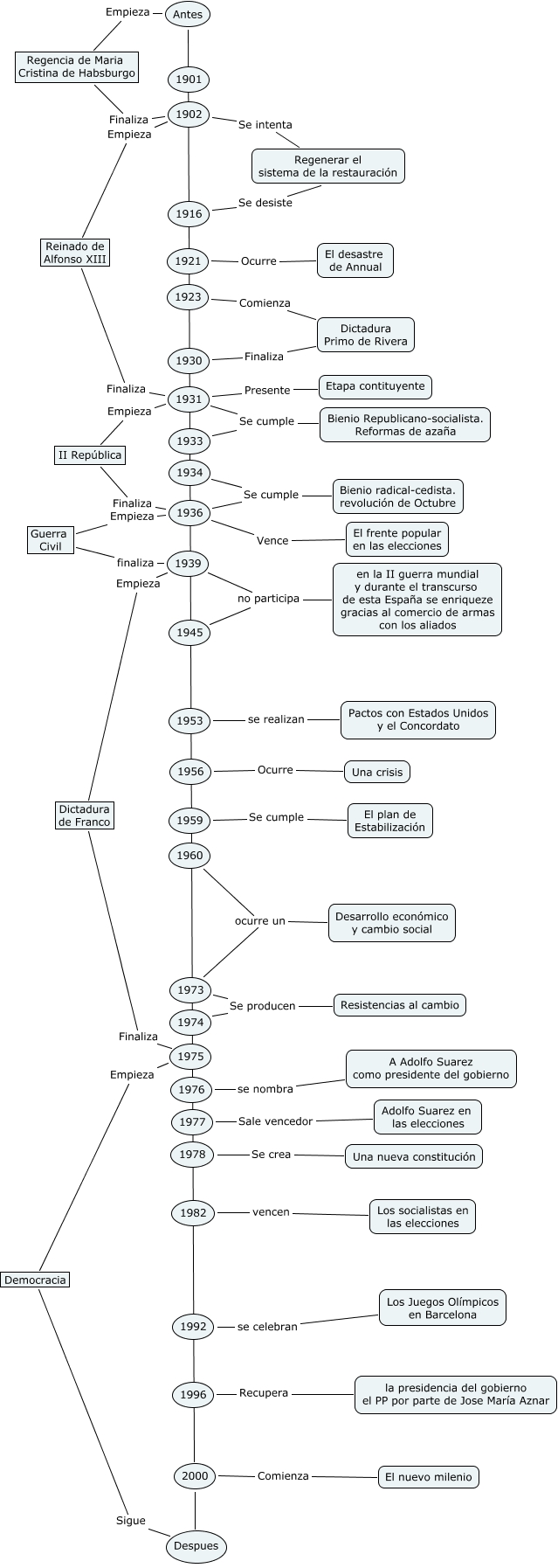 Este mapa conceptual tiene información relacionada a: 09.Alberto Fernández Foncilla.España S.XX, 1939 Empieza Dictadura de Franco, 1975 Empieza Democracia, 1931 Empieza II República, 2000 Despues, Democracia Sigue Despues, Dictadura de Franco Finaliza 1975, 1902 Empieza Reinado de Alfonso XIII, 1902 Se intenta Regenerar el sistema de la restauración, Antes 2000