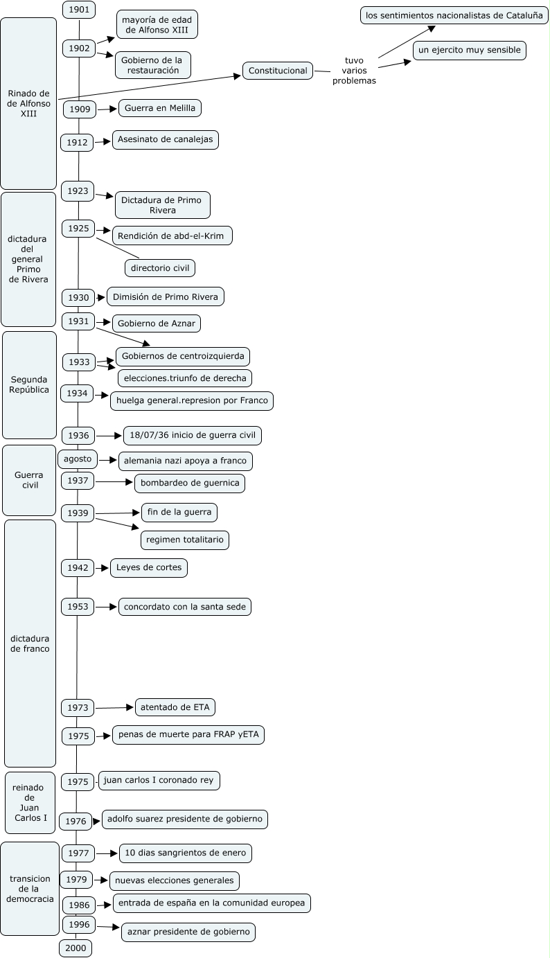 Este mapa conceptual tiene información relacionada a: 23-mario vazquez perez eje cronologico siglo XX, 1975 juan carlos I coronado rey, 1909 Guerra en Melilla, 1912 Asesinato de canalejas, 1931 Gobierno de Aznar, 1925 directorio civil, 1986 entrada de españa en la comunidad europea, 1977 10 dias sangrientos de enero, agosto alemania nazi apoya a franco, 1902 Gobierno de la restauración, 1933 elecciones.triunfo de derecha