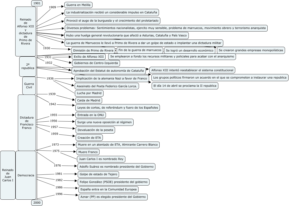 Este mapa conceptual tiene información relacionada a: 07.María Delgado Acosta.España siglo XX, 2ª republica ???? Los grupos políticos firmaron un acuerdo en el que se comprometen a instaurar una republica, Reinado de Alfonso XIII y dictadura de Primo de Rivera Diversos problemas: Sentimientos nacionalistas, ejercito muy sensible, problema de marruecos, movimiento obrero y terrorismo anarquista, Dictadura de Francisco Franco 1942 Leyes de cortes, de referéndum y fuero de los Españoles, Reinado de Alfonso XIII y dictadura de Primo de Rivera Se crearon grandes empresas monopolísticas, Dictadura de Francisco Franco 1957 Devaluación de la peseta, 2ª republica 1931 Gobiernos de Centro-Izquierda, Democracia 1996 Aznar (PP) es elegido presidente del Gobierno, Dictadura de Francisco Franco 1975 Muere Franco, 2ª republica 1932 Aprobación del Estatut de autonomía de Cataluña, Guerra Civil 1936 Lucha por Madrid
