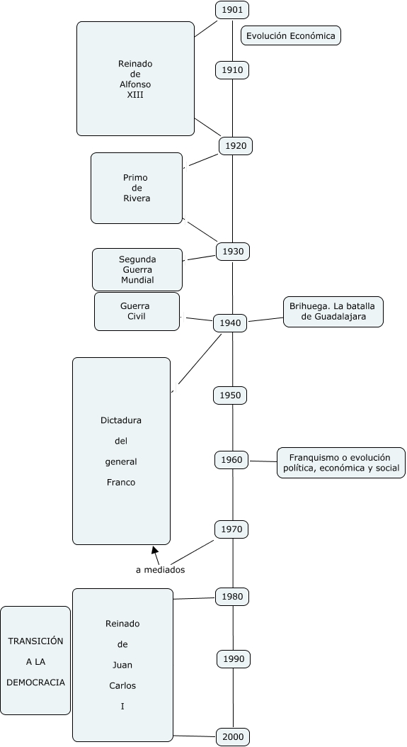 Este mapa conceptual tiene información relacionada a: 01.Esther Aragón Macías.España S.XX, 1930 Primo de Rivera, 1980 ???? Reinado de Juan Carlos I, 1920 Primo de Rivera, 1920 ???? Reinado de Alfonso XIII, 1940 ???? Brihuega. La batalla de Guadalajara, 2000 ???? Reinado de Juan Carlos I, 1901 ???? Reinado de Alfonso XIII, 1960 ???? Franquismo o evolución política, económica y social, 1930 Segunda Guerra Mundial, 1970 a mediados Dictadura del general Franco