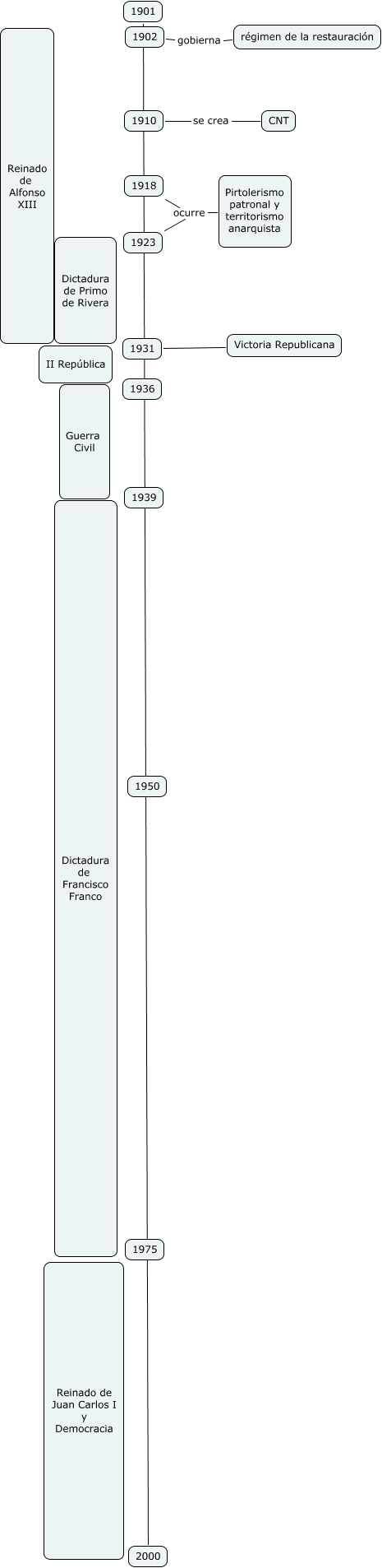 Este mapa conceptual tiene información relacionada a: 23.Juan A. Rguez-Tenorio Torres.España SigloXX, 1923 ocurre Pirtolerismo patronal y territorismo anarquista, 1910 se crea CNT, 1918 ocurre Pirtolerismo patronal y territorismo anarquista, 1902 gobierna régimen de la restauración, 1901 2000, Victoria Republicana 1931