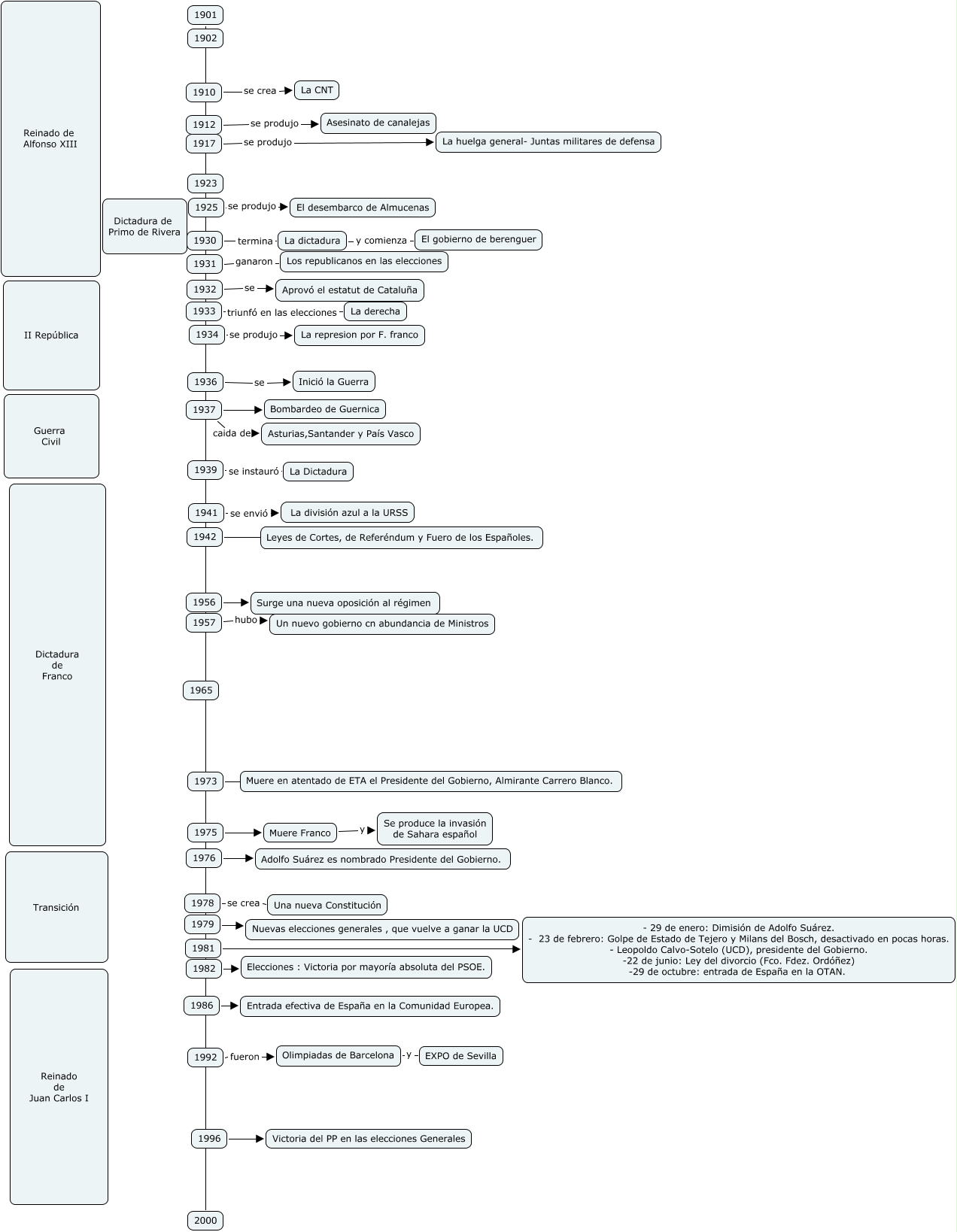 Este mapa conceptual tiene información relacionada a: 03.José María Aragón Meléndez España en el siglo XX, 1957 hubo Un nuevo gobierno cn abundancia de Ministros, 1975 Muere Franco, 1925 se produjo El desembarco de Almucenas, 1941 se envió La división azul a la URSS, 1996 Victoria del PP en las elecciones Generales, 1917 se produjo La huelga general- Juntas militares de defensa, 1930 termina La dictadura, 1934 se produjo La represion por F. franco, 1979 Nuevas elecciones generales , que vuelve a ganar la UCD, 1978 se crea Una nueva Constitución, 1976 Adolfo Suárez es nombrado Presidente del Gobierno., 1901 2000, 1933 triunfó en las elecciones La derecha, 1932 se Aprovó el estatut de Cataluña, 1942 ???? Leyes de Cortes, de Referéndum y Fuero de los Españoles., 1912 se produjo Asesinato de canalejas, 1939 se instauró La Dictadura, 1937 caida de Asturias,Santander y País Vasco, Olimpiadas de Barcelona y EXPO de Sevilla, 1956 Surge una nueva oposición al régimen