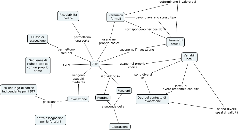 Questioni apprendimento uso STP, STP si dividono in Funzioni, Parametri attuali determinano il valore dei Parametri formali, Variabili locali hanno diversi spazi di validità Dati del contesto di invocazione, STP usano nel proprio codice Variabili locali, Routine a seconda della Restituzione, STP si dividono in Routine, Sequenze di righe di codice con un proprio nome sono STP, Parametri formali corrispondono per posizione Parametri attuali, Invocazione posizionata su una riga di codice indipendente per i STP, STP permettono una certa Ricopiabilità codice